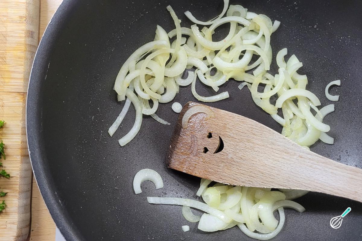 Leve a cebola para dourar em uma frigideira com um pouco de azeite. Tempere com sal, que também ajuda e acelerar o processo e deixe até que esteja translúcida.