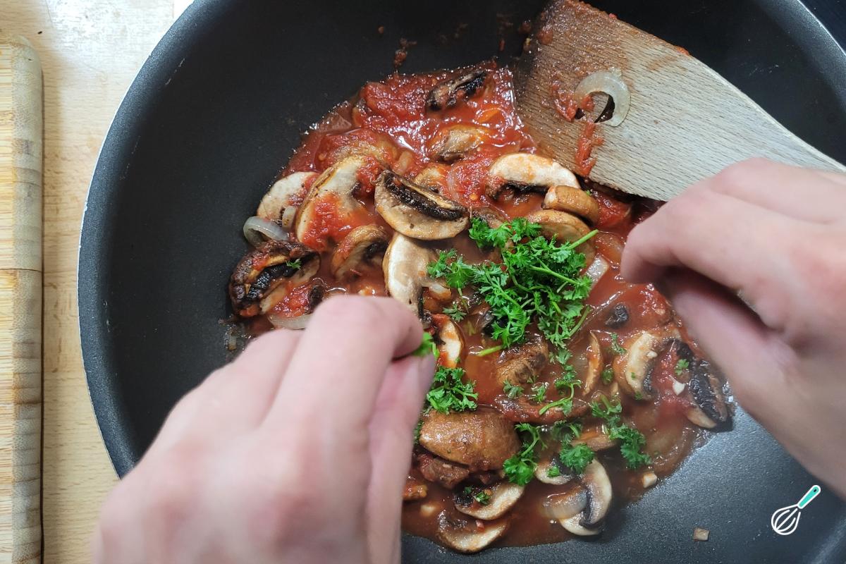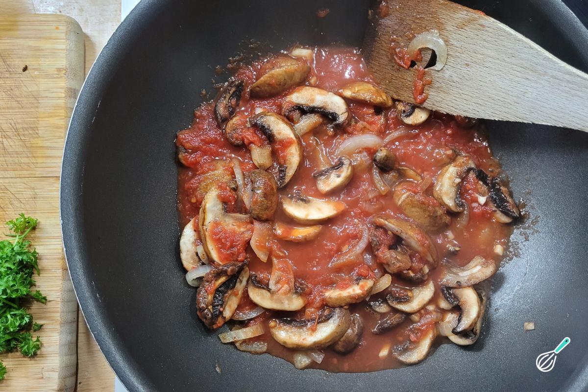 Deixe apenas até começar a perfumar e coloque a passata de tomate. Tempere com sal e pimenta do reino. Misture e deixe reduzir um pouco até criar um recheio espesso.