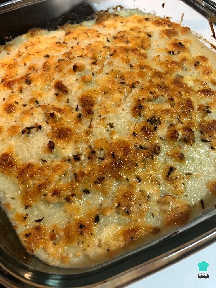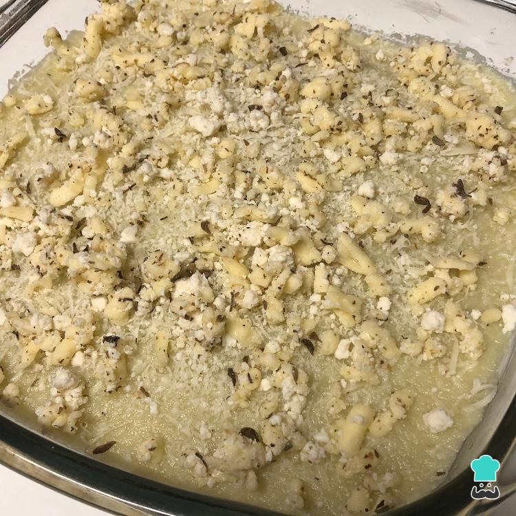 Por fim coloque todo o purê de couve flor por cima e finalize com muçarela ralada por cima.