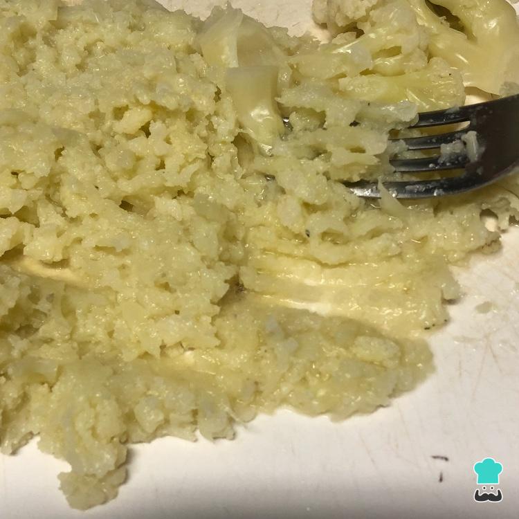 O passo seguinte é escorrer a água e amassar a couve flor com um garfo.