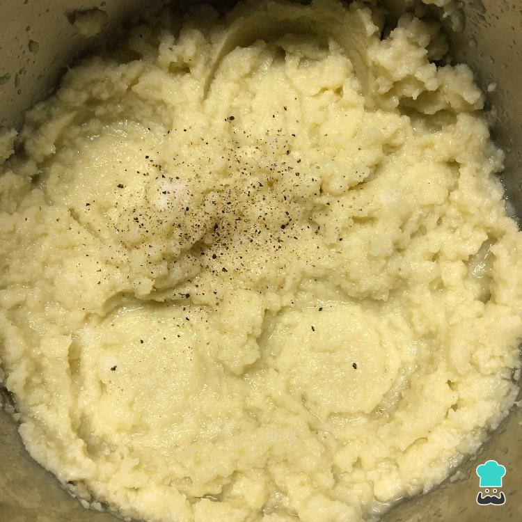 Se quiser pode temperar a couve flor amassada com sal e pimenta e usá-la já no escondidinho. Caso prefira um purê mais liso, use um mixer manual para alisar um pouco. Reserve.