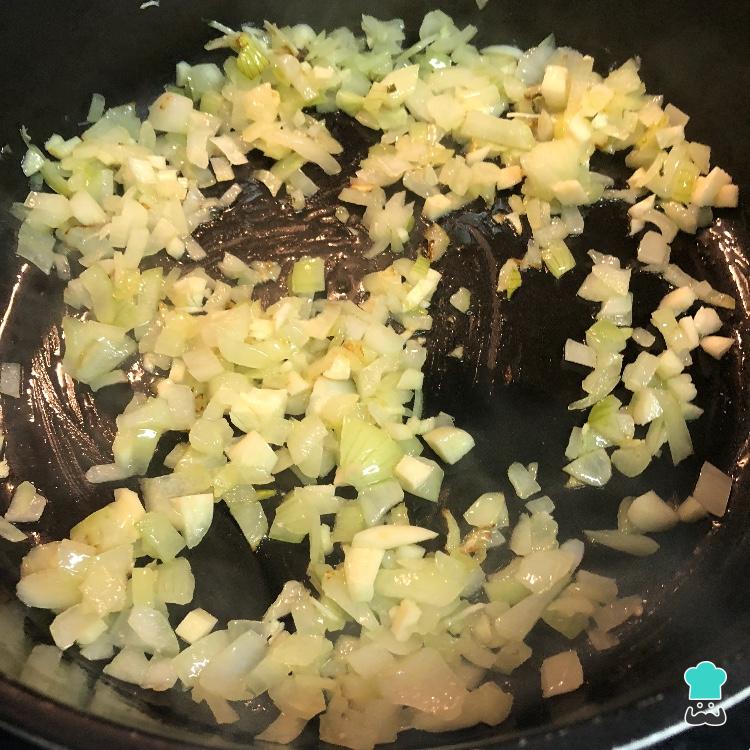 O passo seguinte deste escondidinho de frango com requeijão é, em uma frigideira grande, refogar a cebola em um pouco de azeite e depois adicionar o alho.