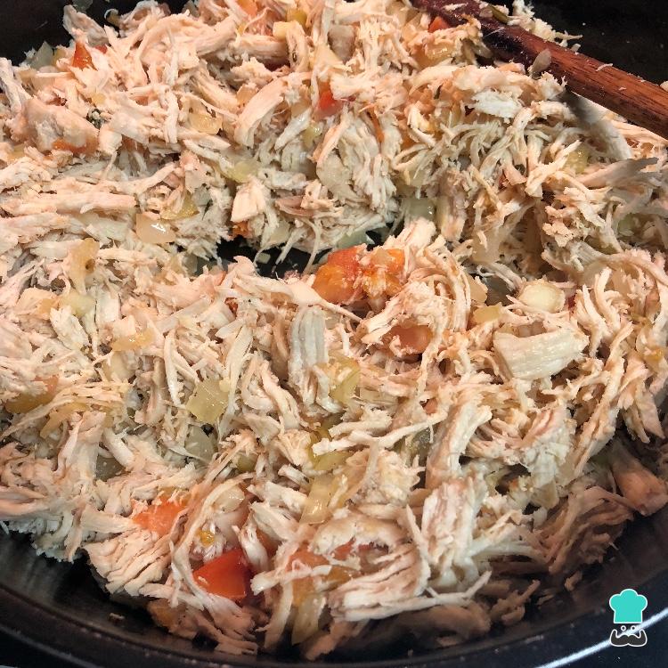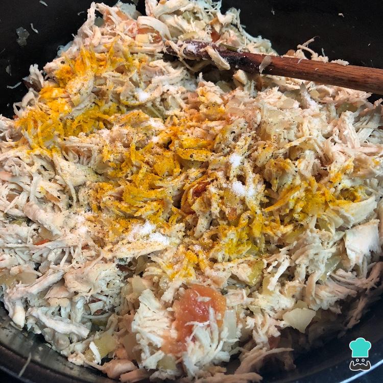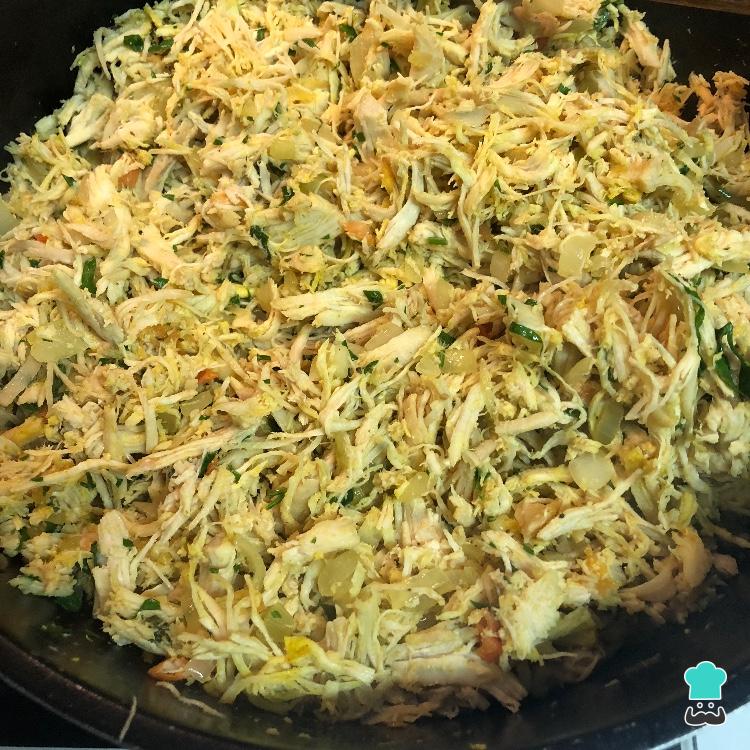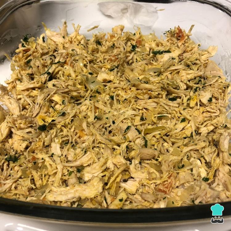 Acrescente o frango já cozido e desfiado. Este é o recheio do escondidinho de couve flor e frango.