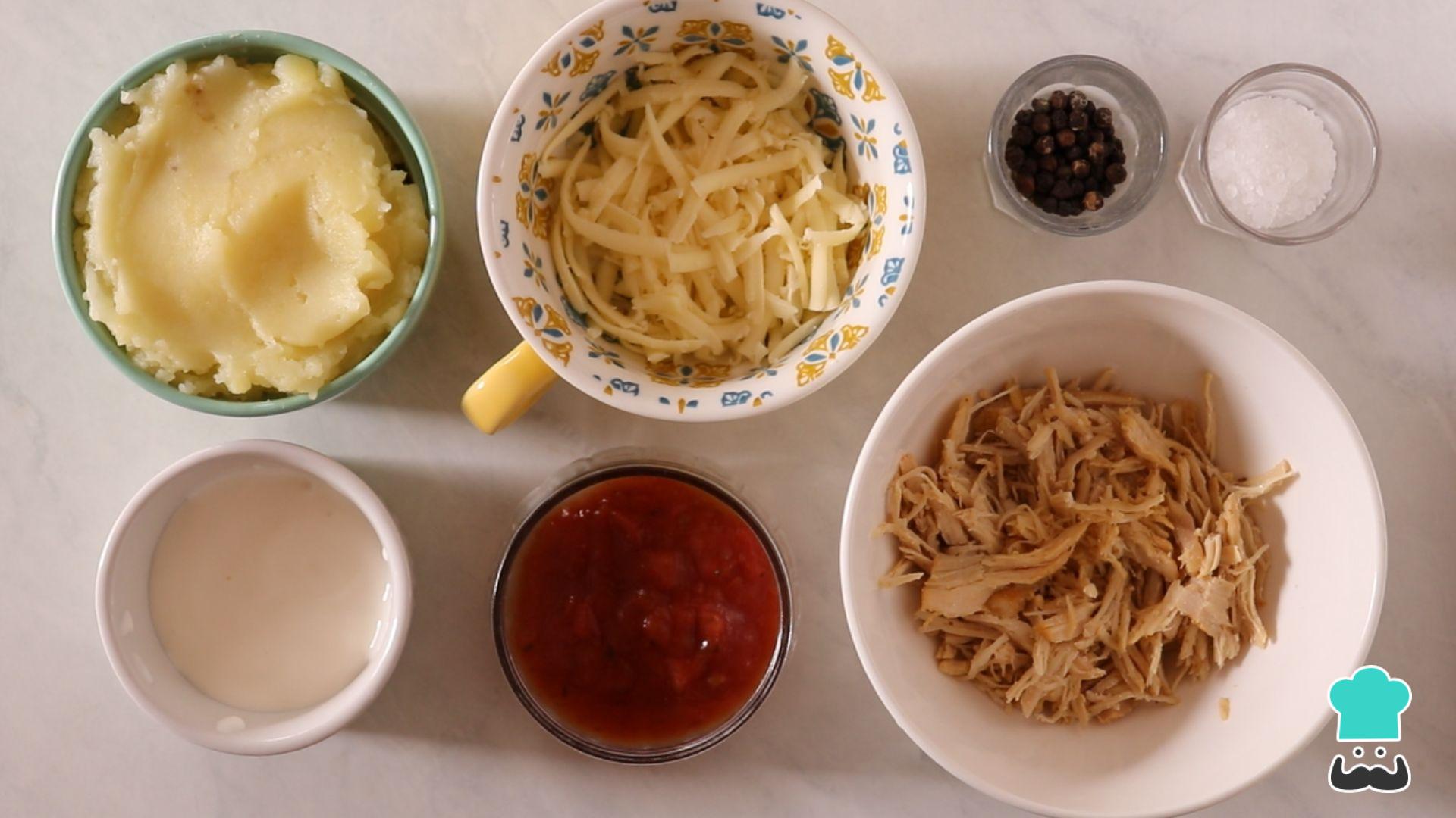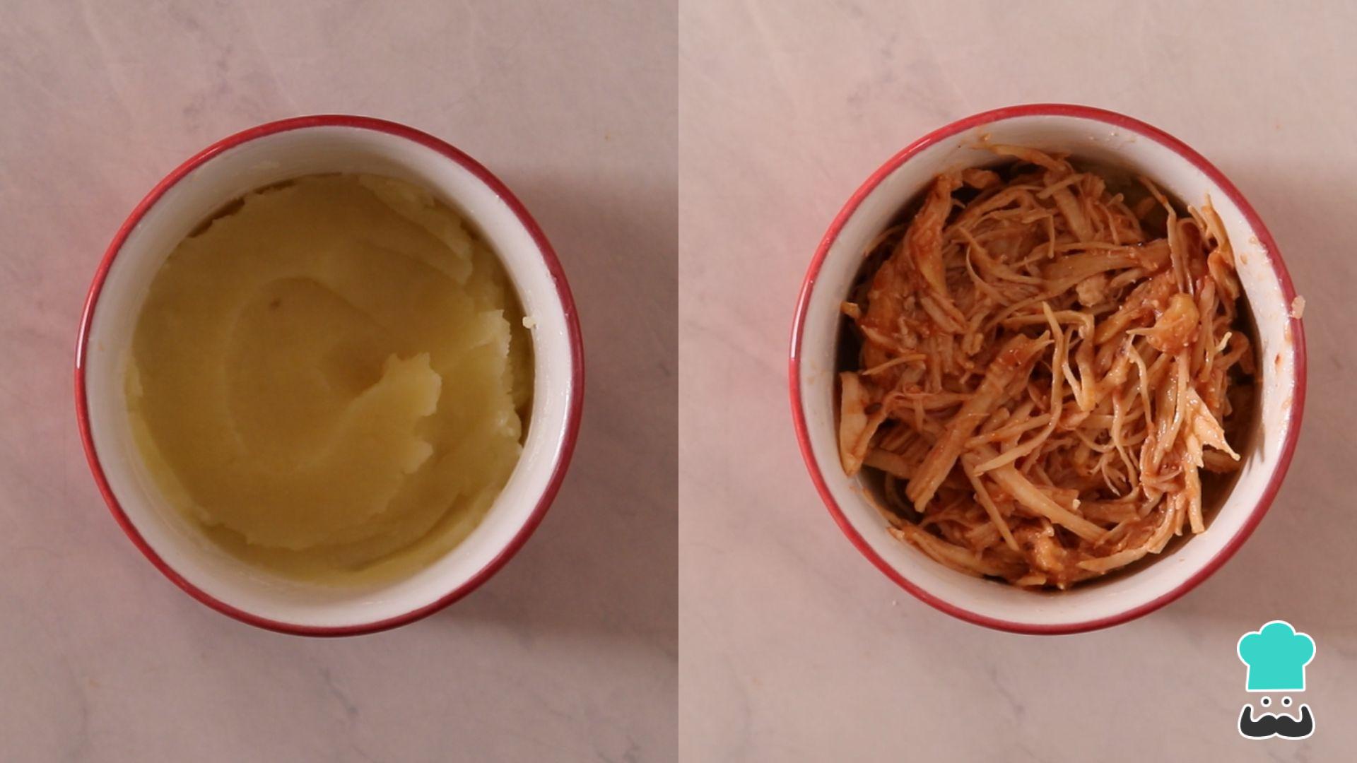 Comece separando os ingredientes para o nosso escondidinho de frango cremoso. A batata já deve estar cozida e amassada e o frango cozido e desfiado. Os dois ingredientes foram temperados com sal e pimenta.