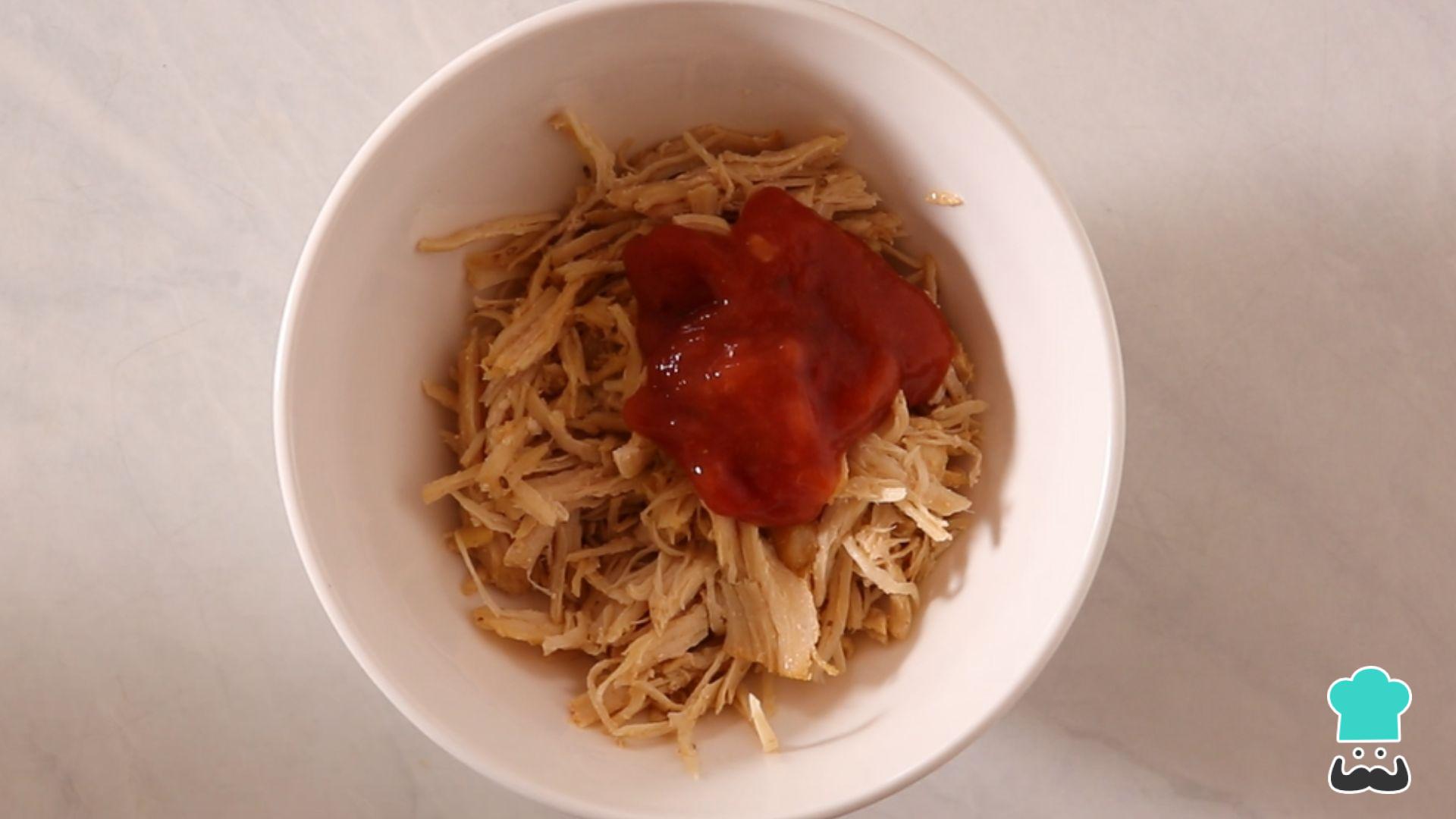 Em uma tigela misture o frango desfiado e o molho de tomate.