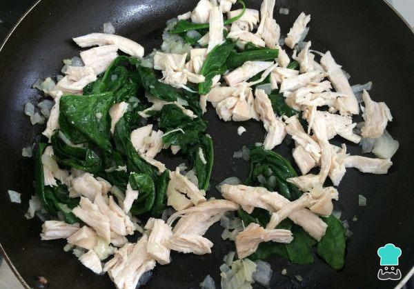 Junte o frango desfiado, o espinafre lavado ao refogado e deixe cozinhar por dois minutos.