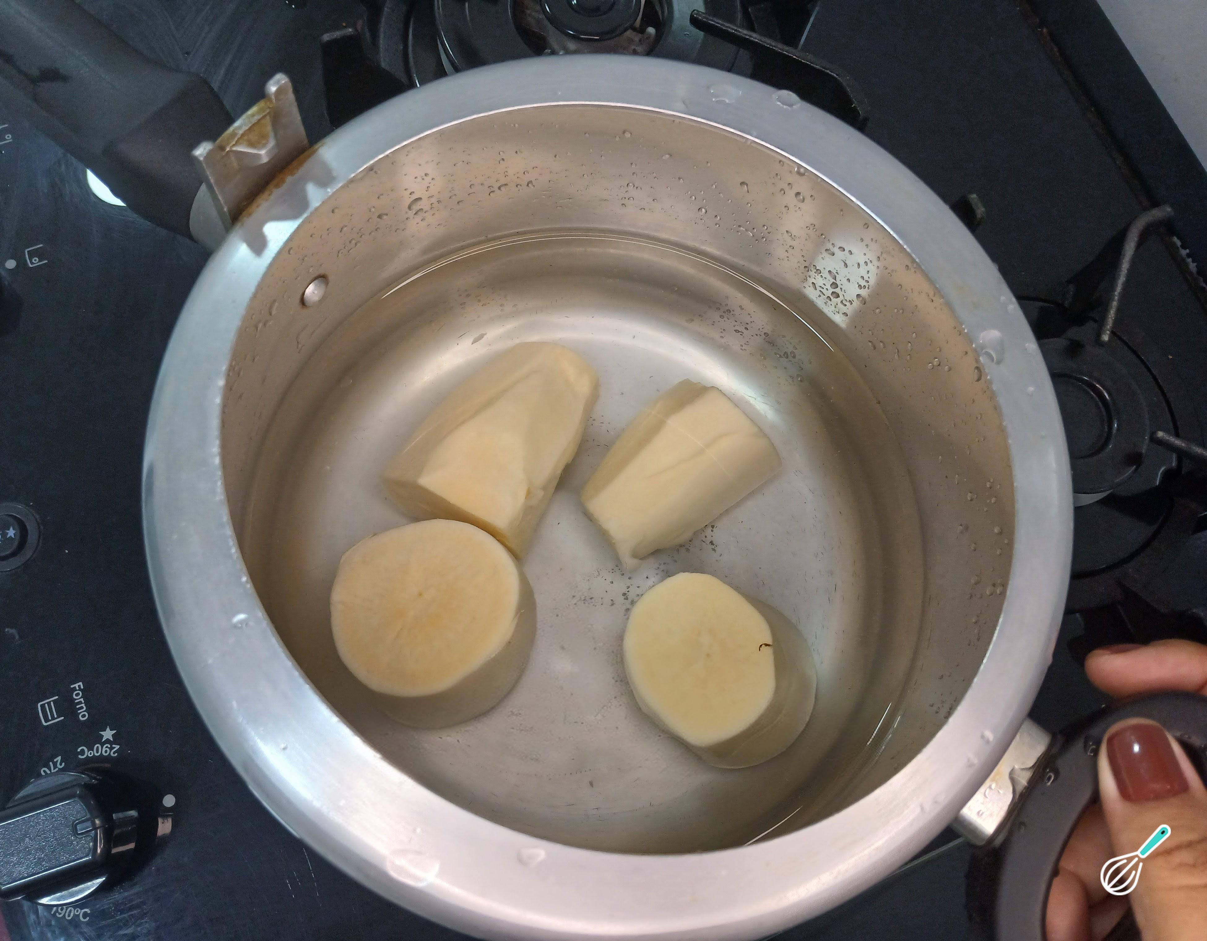 Feito isso, retire a casca da mandioca e corte em pedaços médios. Coloque-os dentro da panela de pressão e cubra com água, tampe a panela e assim que pegar pressão, marque 20 minutos. Como a mandioca será amassada para fazer o purê, é interessante que fique bem cozida, assim ajuda no processo. Depois de marcar os 20 minutos desligue o fogo e deixe a pressão sair naturalmente, e, após o processo, retire a mandioca.