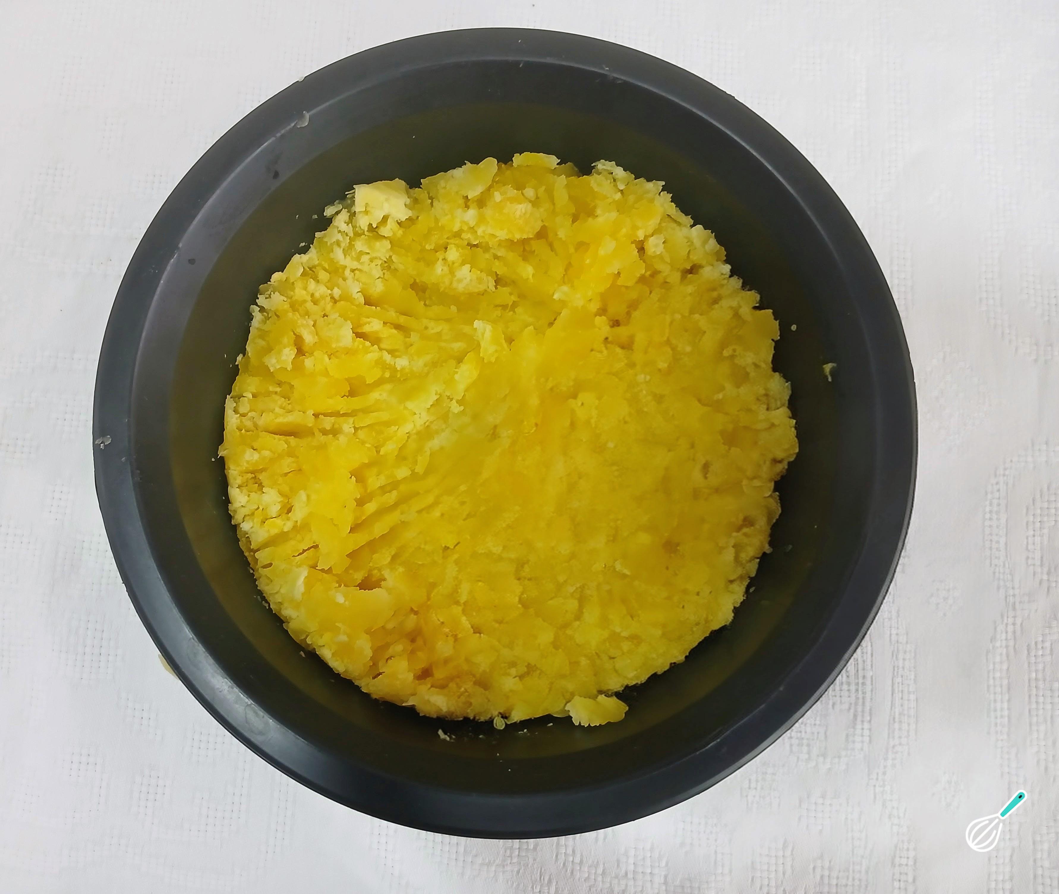 Depois de cozida a mandioca, coloque em um prato, amasse com um garfo com ela ainda quente e reserve.