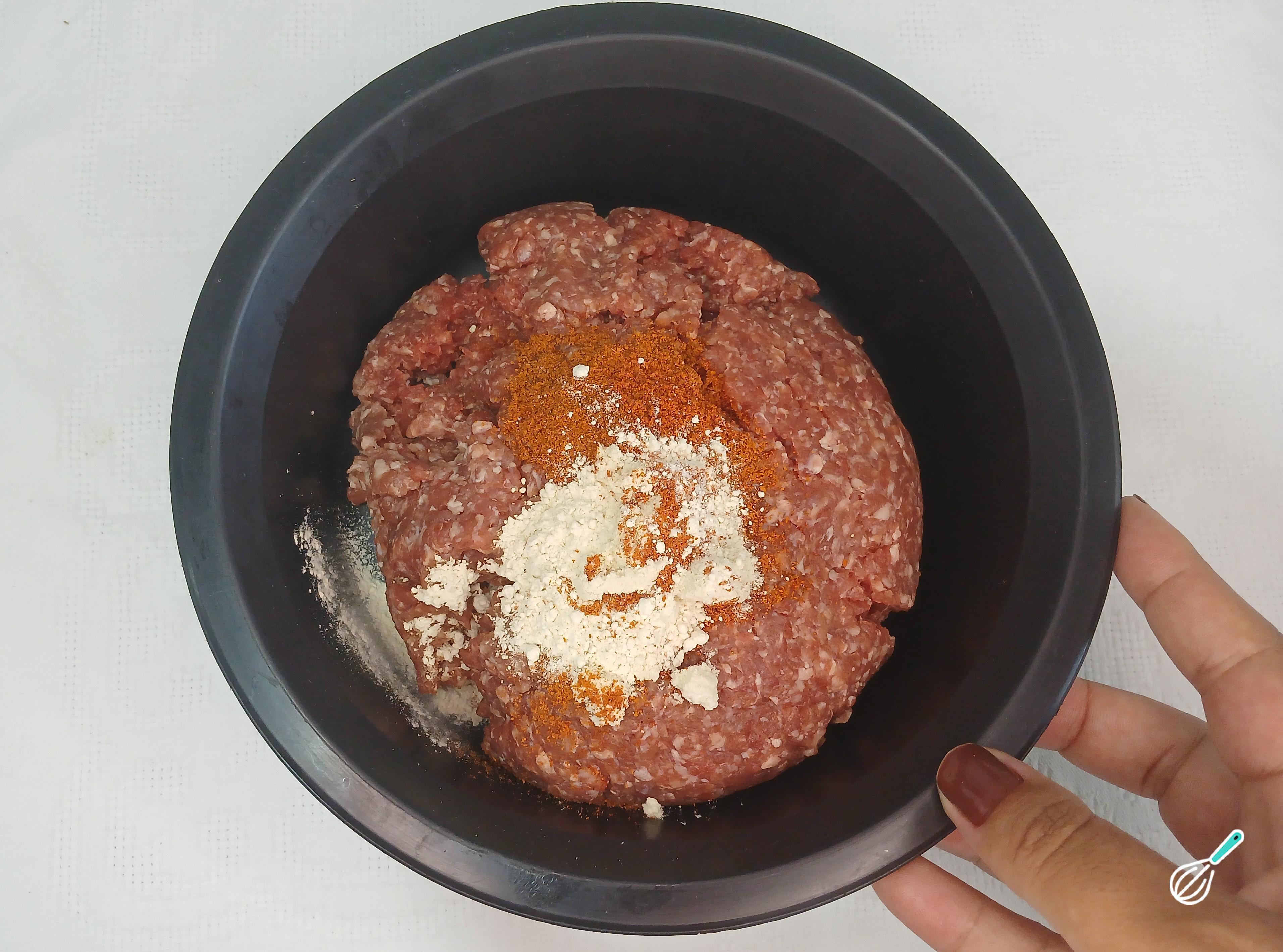 Tempere a carne com alho e cebola em pó. Coloque também as pápricas doce e picante. Misture bem para absorver os sabores. Coloque sal e pimenta.