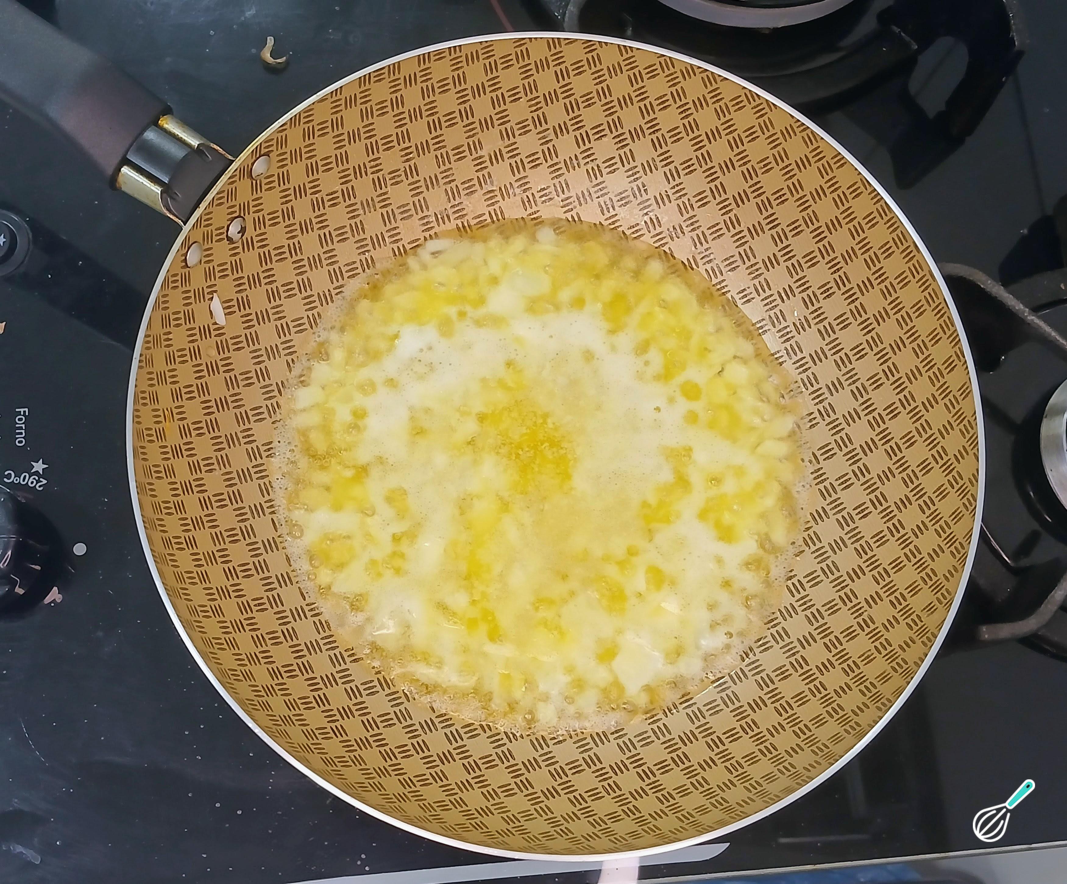 Em uma panela, coloque a outra metade da cebola cortada em cubos e margarina ou manteiga. Refogue a cebola em fogo baixo, mexendo sempre.