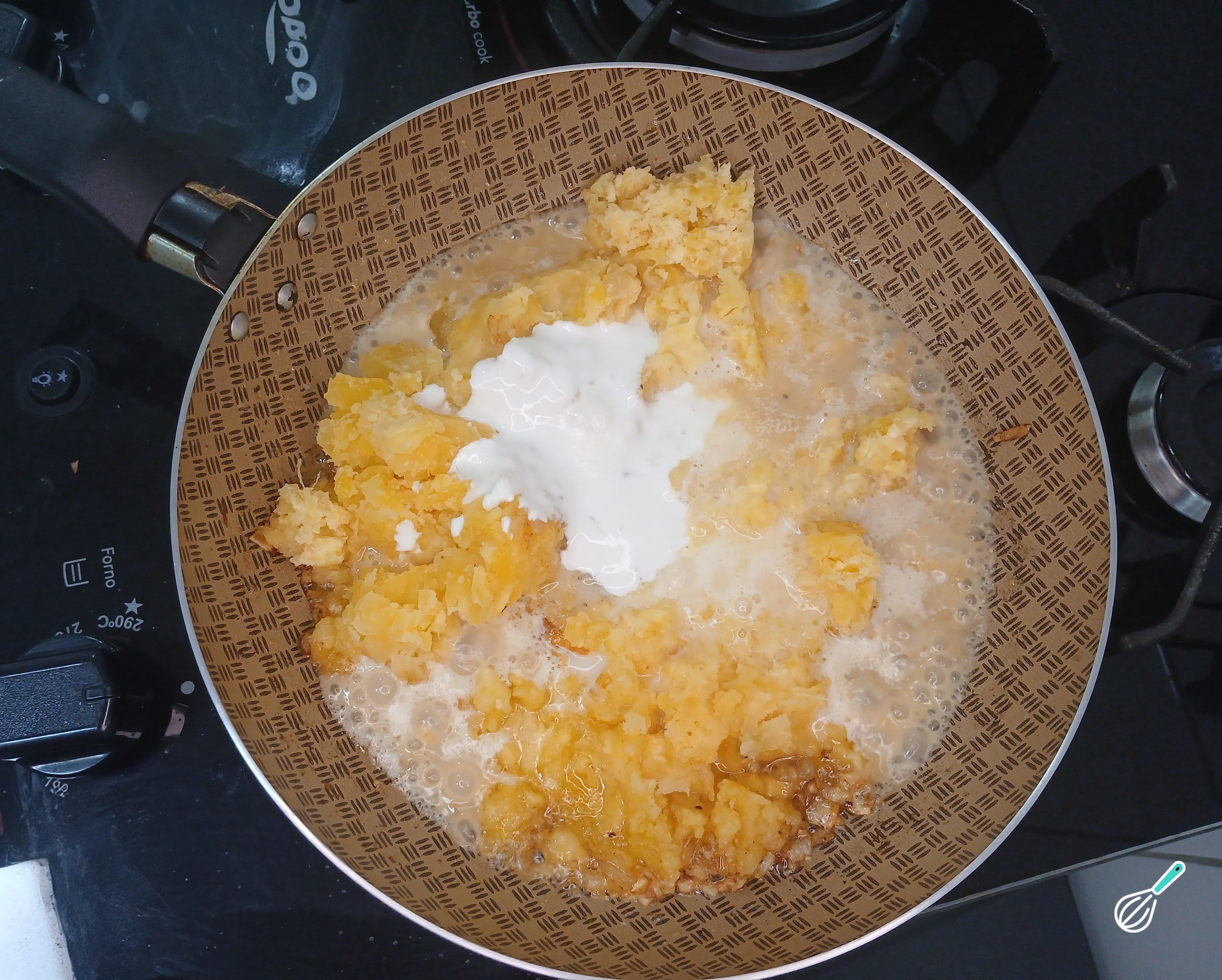 Adicione a mandioca reservada, leite, sal, creme de leite ou creme vegetal e mexa bem.