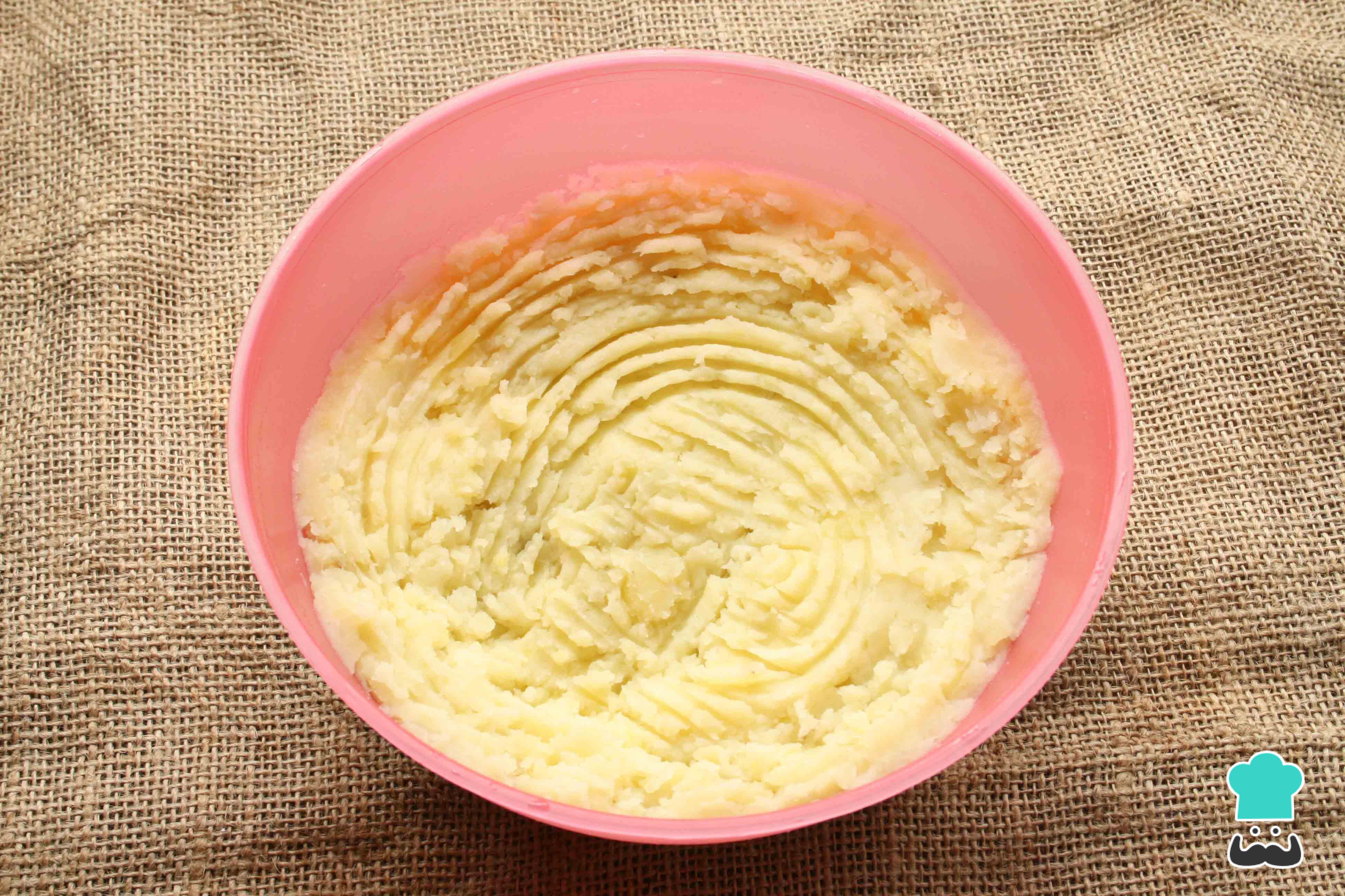 Depois do passo anterior escorra a água das batatas e amasse-as até virar um purê. Tempere com sal, pimenta e um fio de azeite.