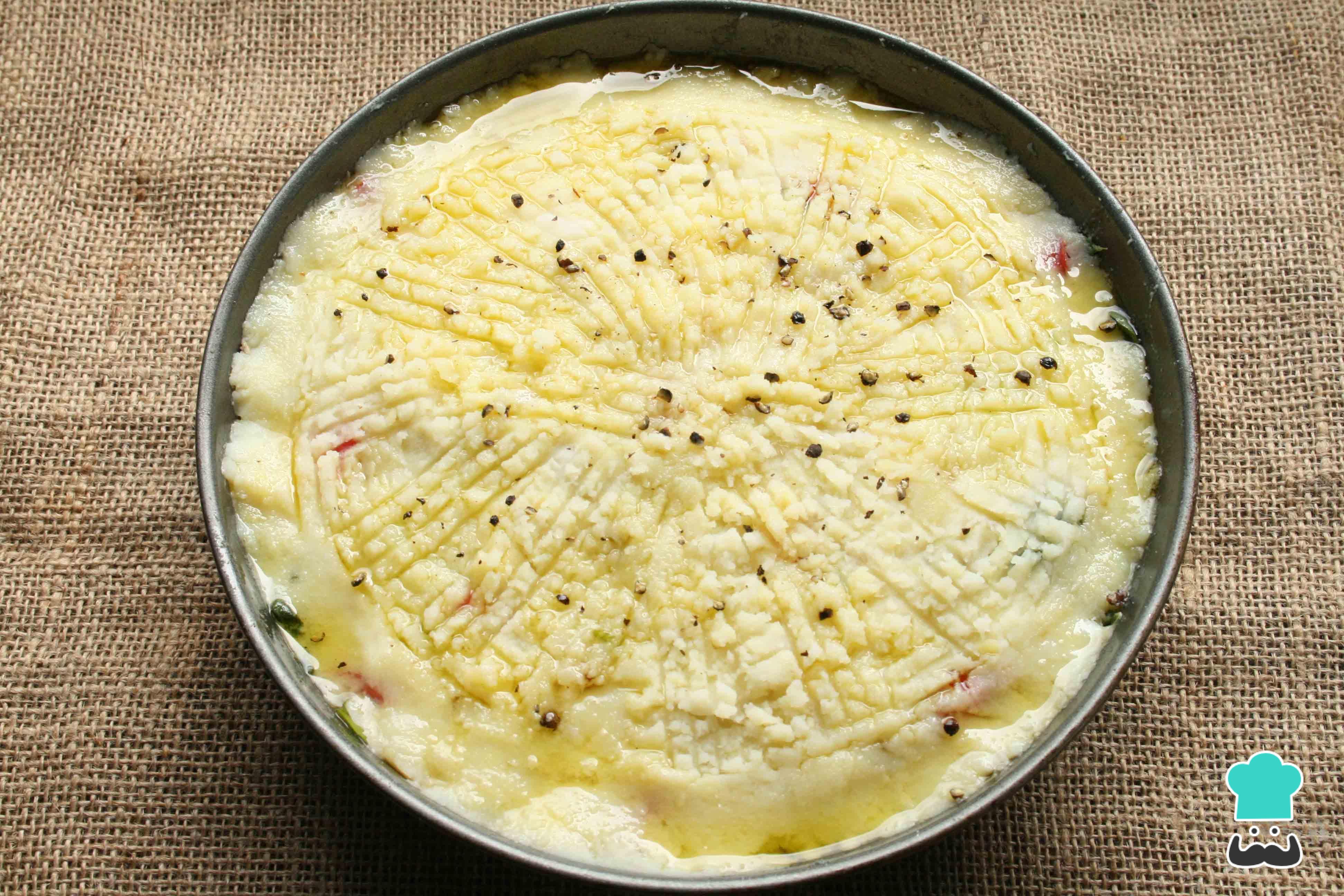 Cubra o peixe com a mistura de espinafre e tomate e complete com o purê de batata, como na fotografia. Em vez de usar ovo, pincele este escondidinho fácil com um frio de azeite e polvilhe pimenta moída. Leve ao forno a 200ºC por 40 minutos.