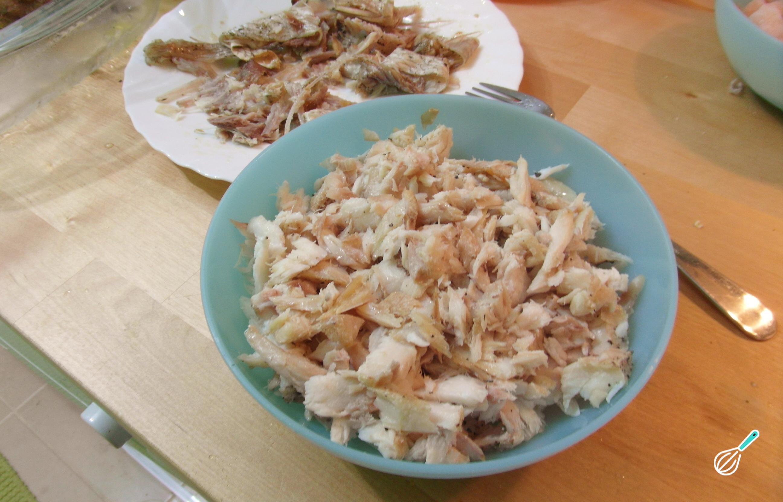 Enquanto as batatas cozinham, desfie as postas de peixe rejeitando pele e espinhas. Neste caso aproveitei sobras de pargo no forno que preparei no dia anterior.