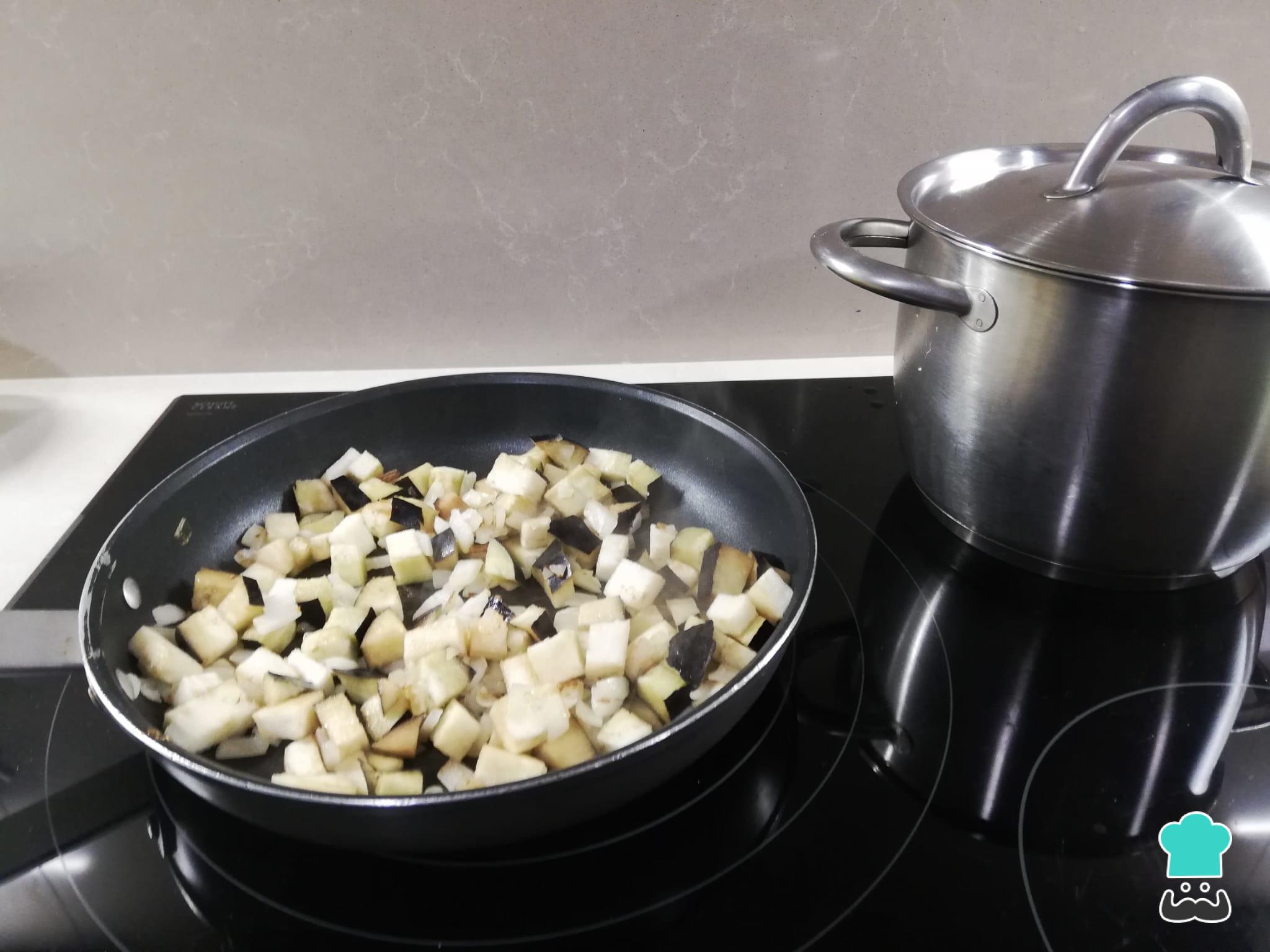 Refogue a cebola em um pouco de azeite e, depois que os pedaços estiverem dourados, acrescente a berinjela. Espere aproximadamente 10 minutos em fogo médio, para que os pedaços estejam moles e bem refogados. Coloque sal e pimenta a gosto.