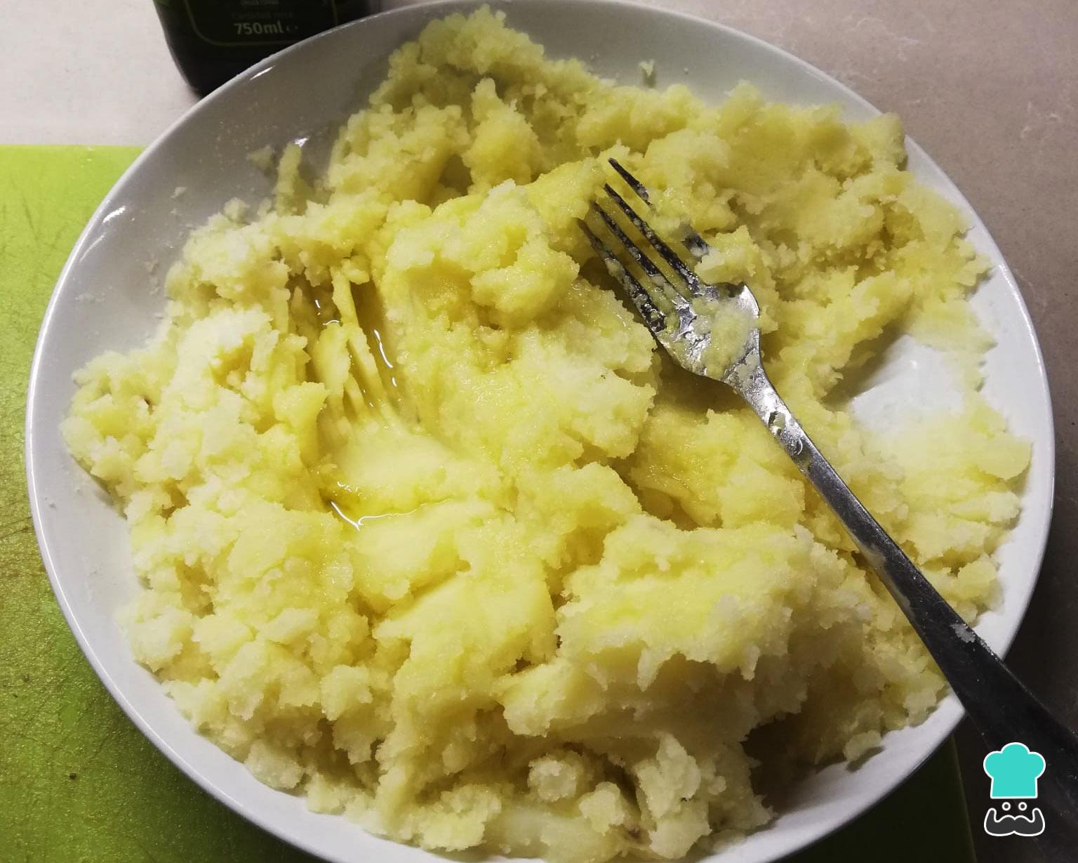 Verifique se a batata já está cozida. Se sim, chegou a hora de escorrê-la e colocá-la numa superfície lisa (um prato grande, por exemplo). Com um garfo amasse os pedaços de batata e, ao mesmo tempo, acrescente azeite para que se forme uma espécie de massa cremosa.