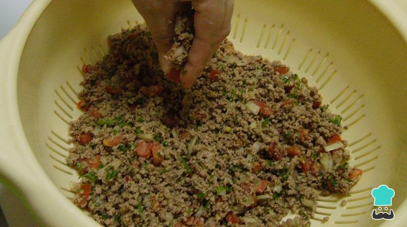 Enquanto isso prepare a o recheio da esfiha aberta, misturando em um recipiente todos os respetivos ingredientes. Mexa bem para incorporar e reserve.