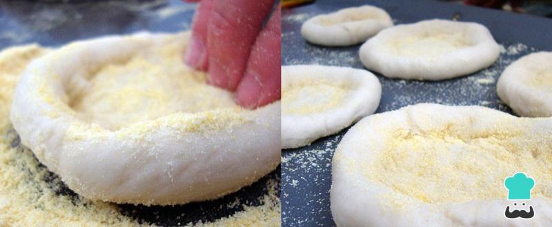 Separe da massa várias bolinhas do tamanho de bolas de pingue-pingue. Molde-as com as mãos de forma a se assemelharem a uma base de pizza com as laterais altas. Para ficarem mais crocantes após a cozedura pode polvilhar fubá.