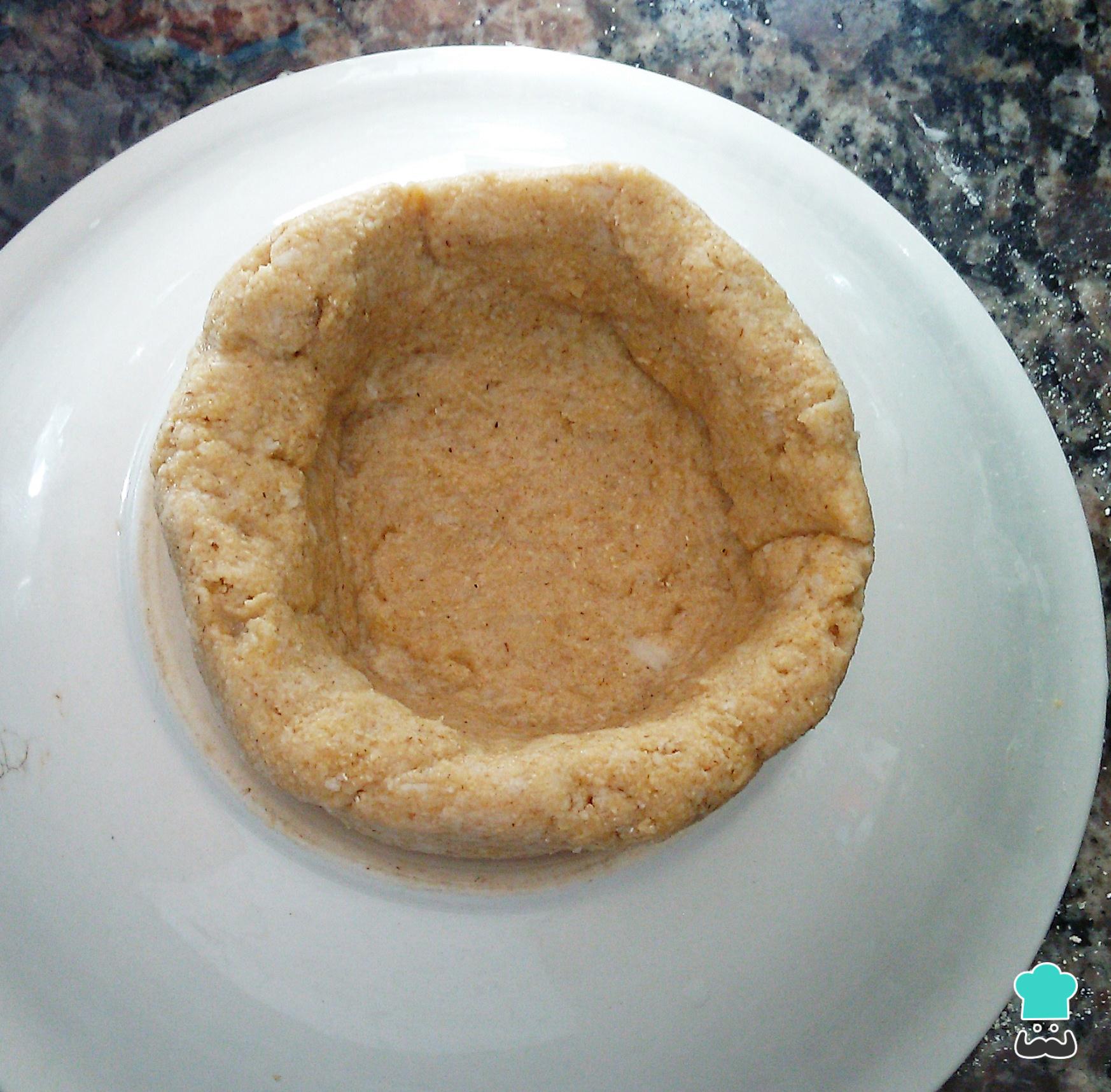 Molde a massa, de preferência deixando o molde com a massa mais fina, e leve para assar no forno a 180ºC até dar uma leve dourada (cerca de 10 a 15 minutos no forno já quente).