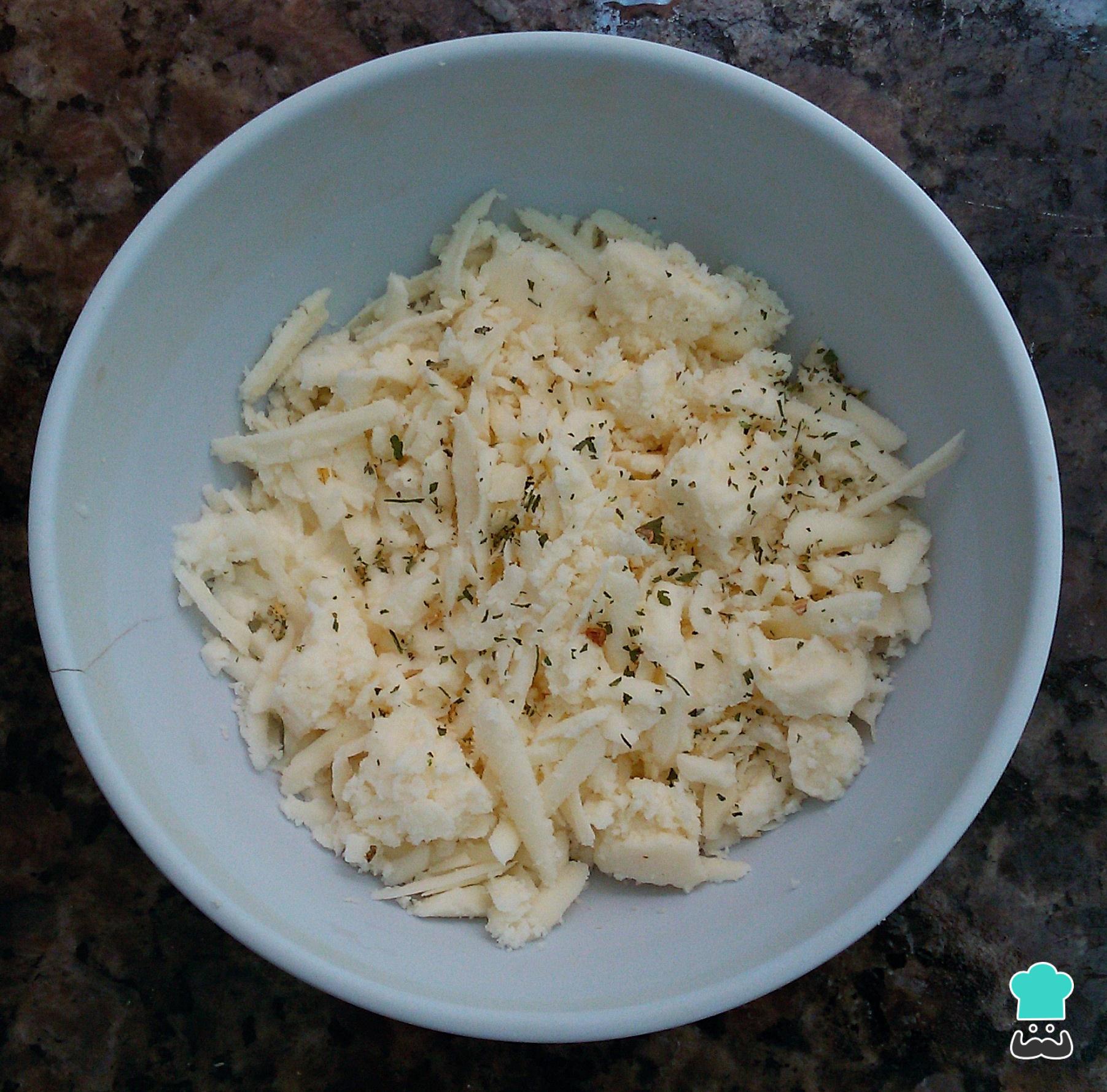 Enquanto isso prepare o recheio. Para o recheio de queijo rale o queijo fresco, coloque o creme de leite, uma pitada de sal e orégano a gosto. Misture tudo.