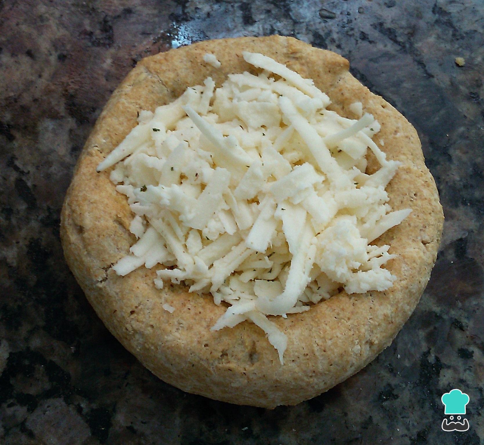 Retire a massa do forno, coloque o recheio e devolva pro forno até o queijo dourar.