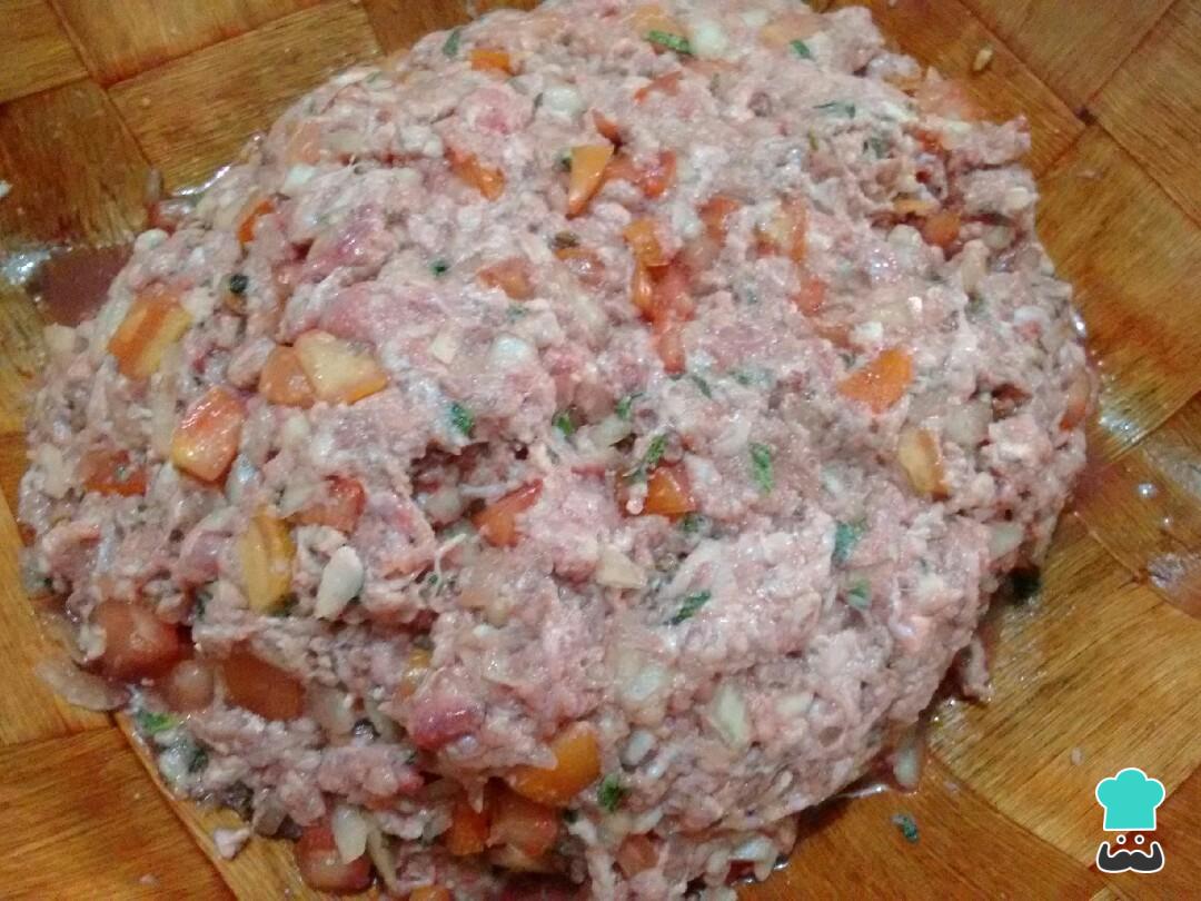 Para o recheio: pique a cebola e a hortelã e corte os tomates em cubinhos. Junte à carne, triture a folha de louro e acrescente. Esprema os limões, junte ao suco o sal e a pimenta e tempere a carne com eles. Misture tudo muito bem e em seguida leve à geladeira e para descansar.