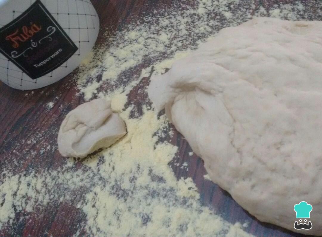 Enquanto a carne descansa, verifique se a massa já dobrou de tamanho. Se sim, continue preparando esta receita de esfiha de carne moída aberta: coloque a massa numa superfície lisa e enfarinhada com fubá e divida em pequenas porções iguais, que serão as esfihas.