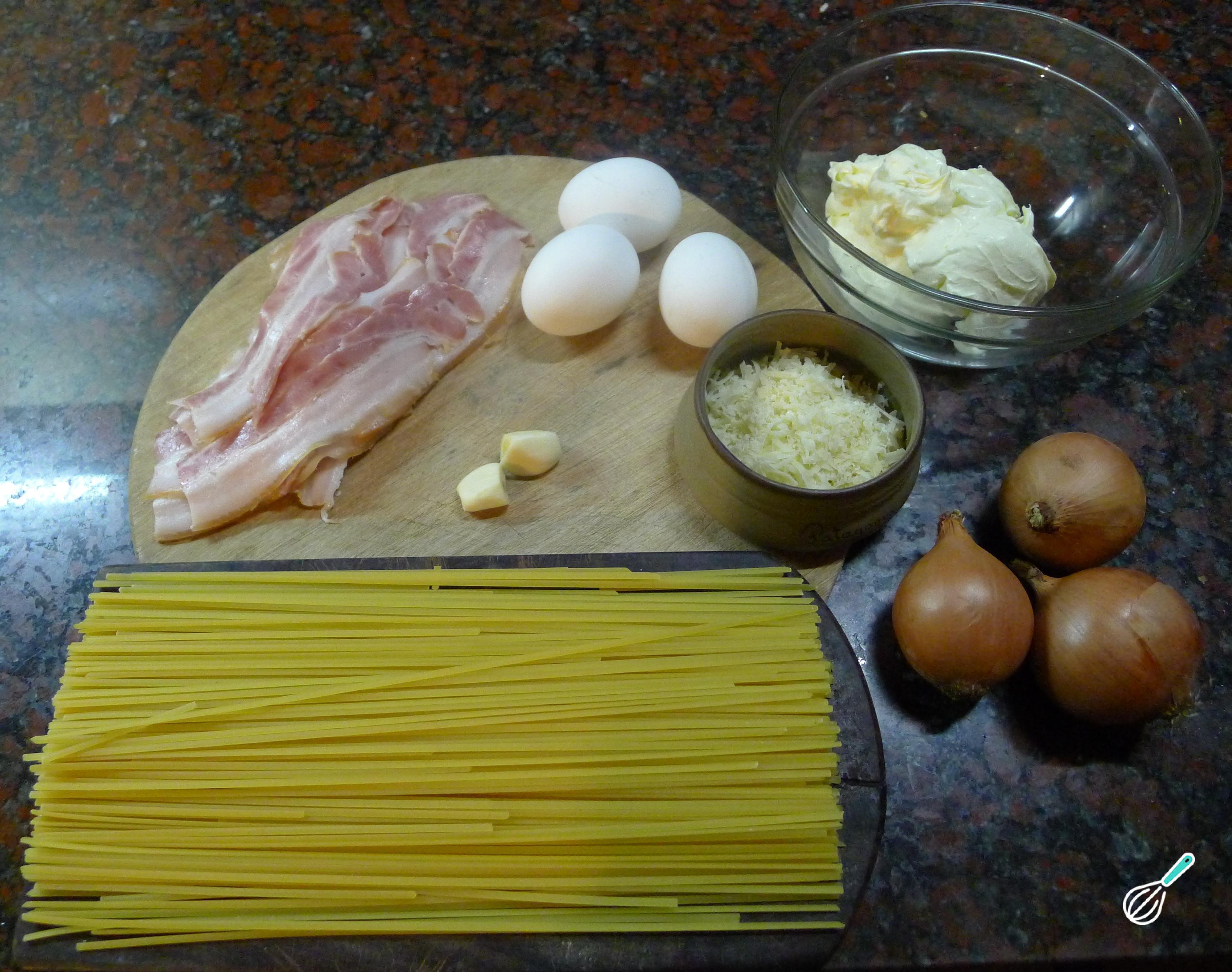 Prepare os ingredientes para fazer esse espaguete à carbonara simples.