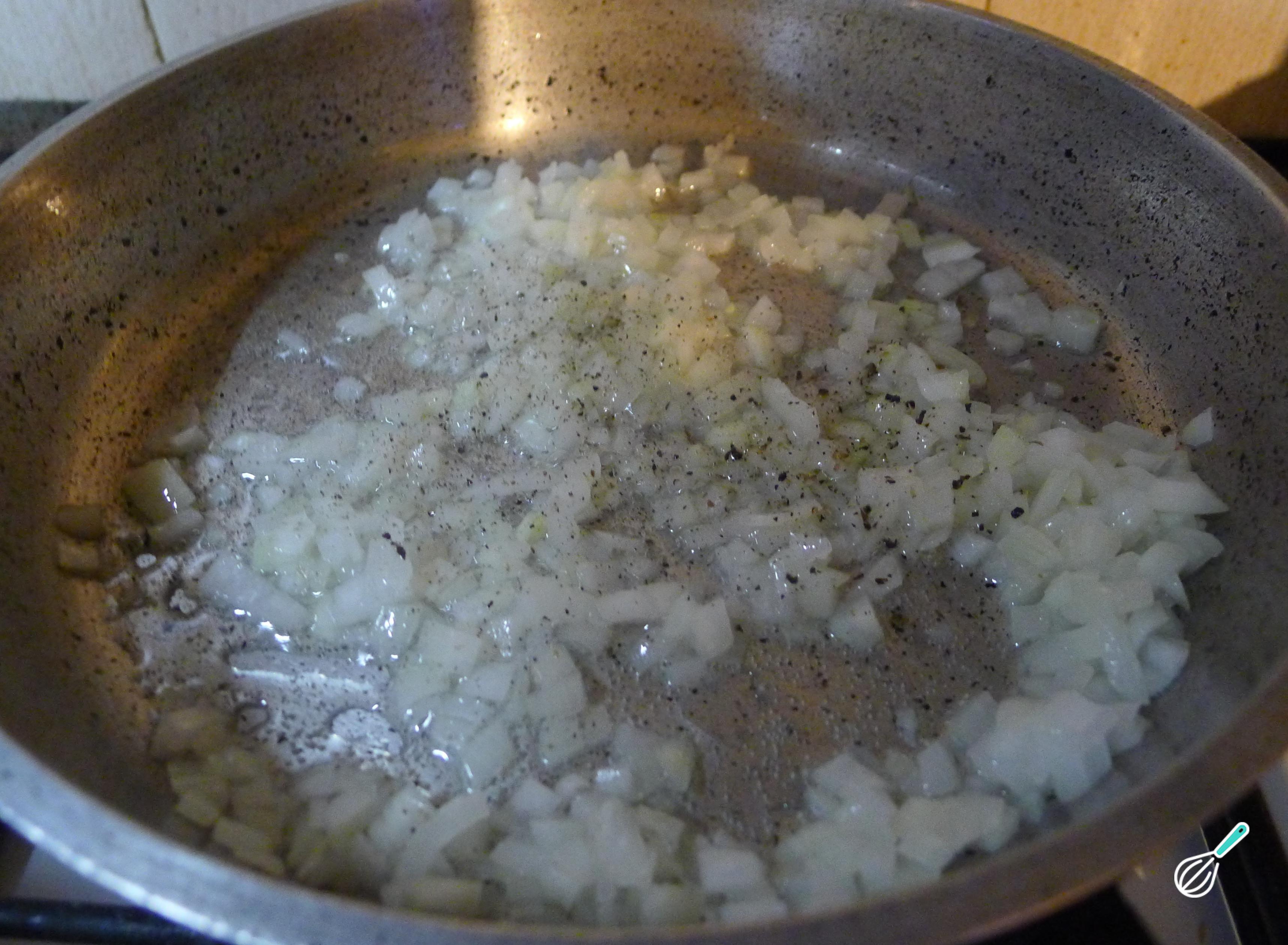 Descasque e pique finamente a cebola. Refogue na frigideira com uma colher de sopa de manteiga.