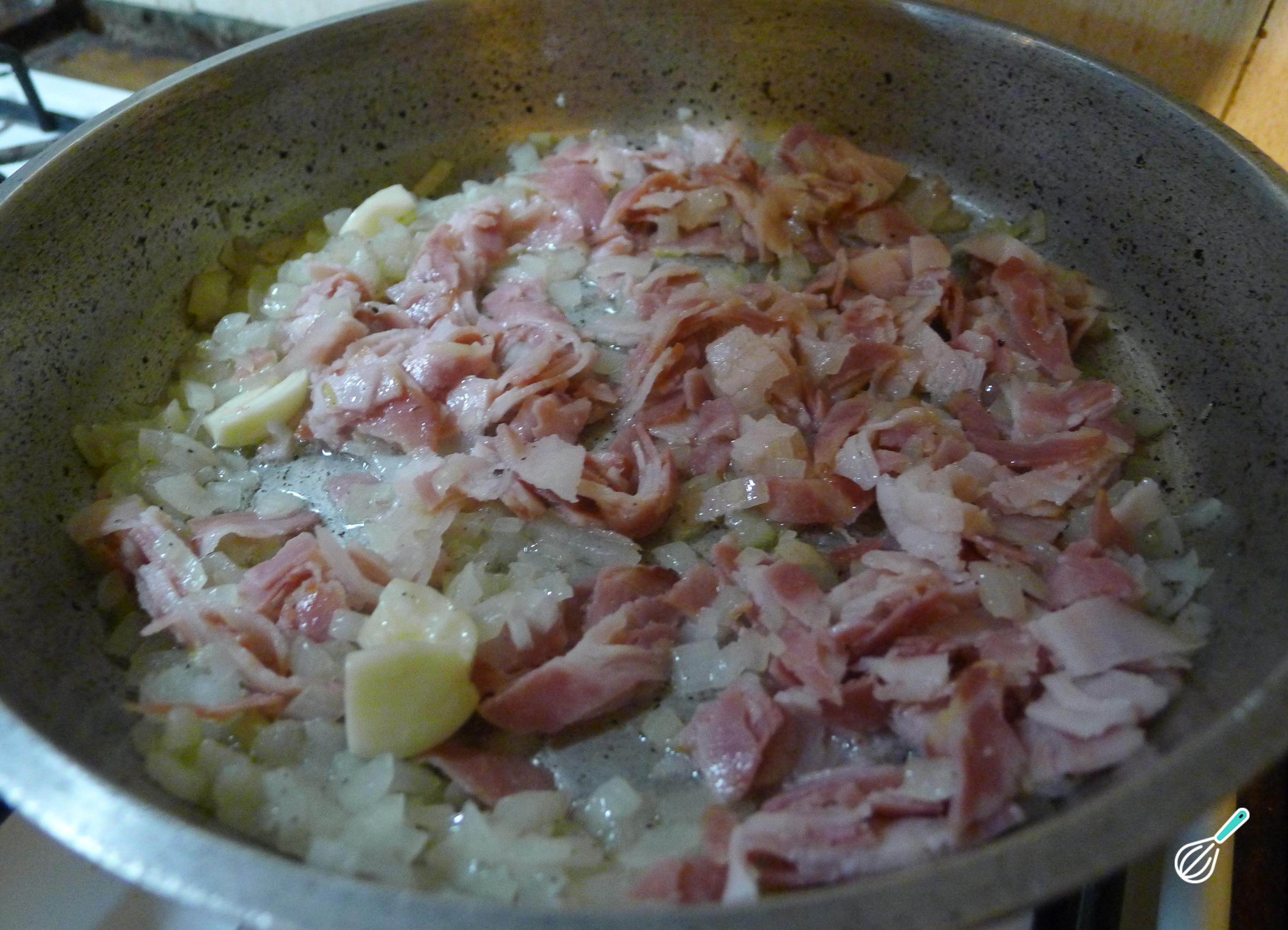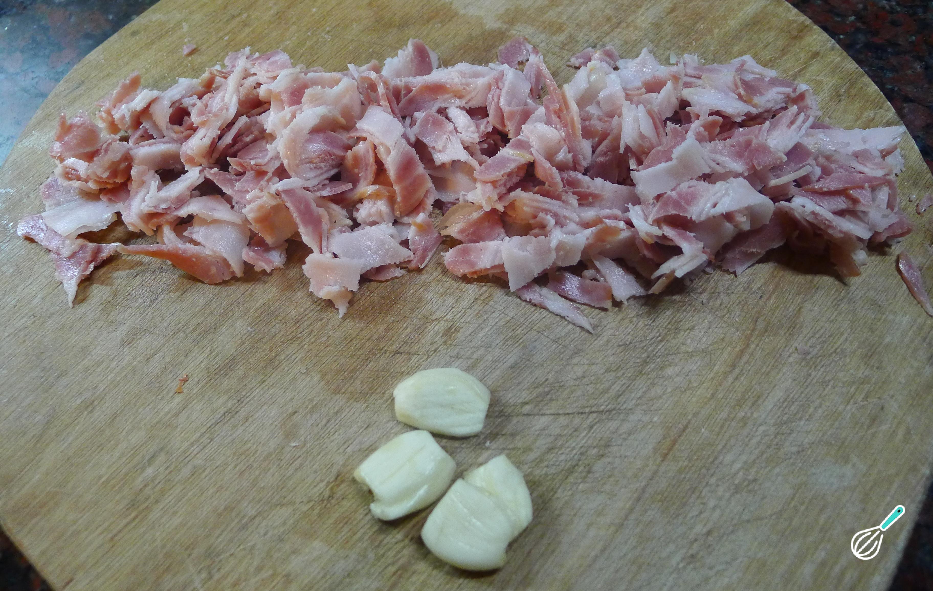 Corte o bacon defumado em tirinhas e amasse o alho previamente descascado.