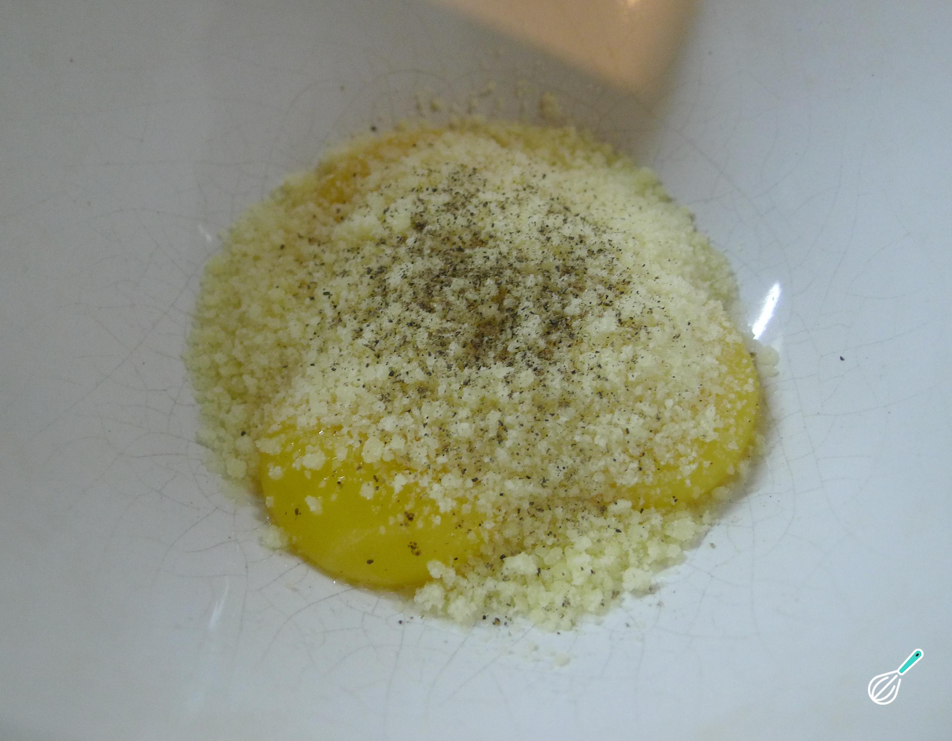 Misture as gemas de ovo com 100 g de queijo parmesão. Tempere com sal e pimenta do reino.