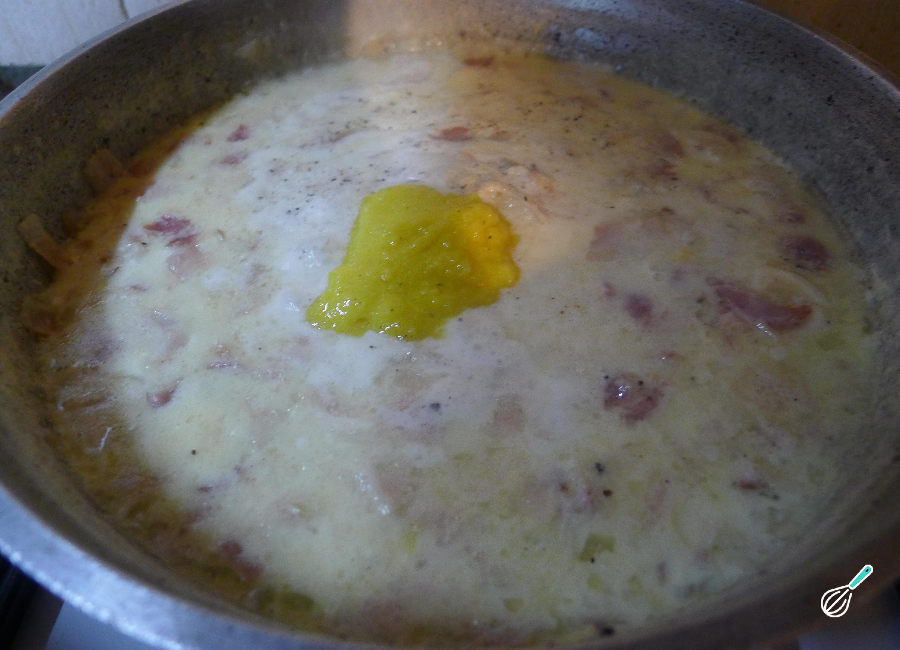 Adicione o creme de leite ao refogado e deixe cozinhar em fogo baixo por 5 minutos para continuar com a preparação do molho carbonara.