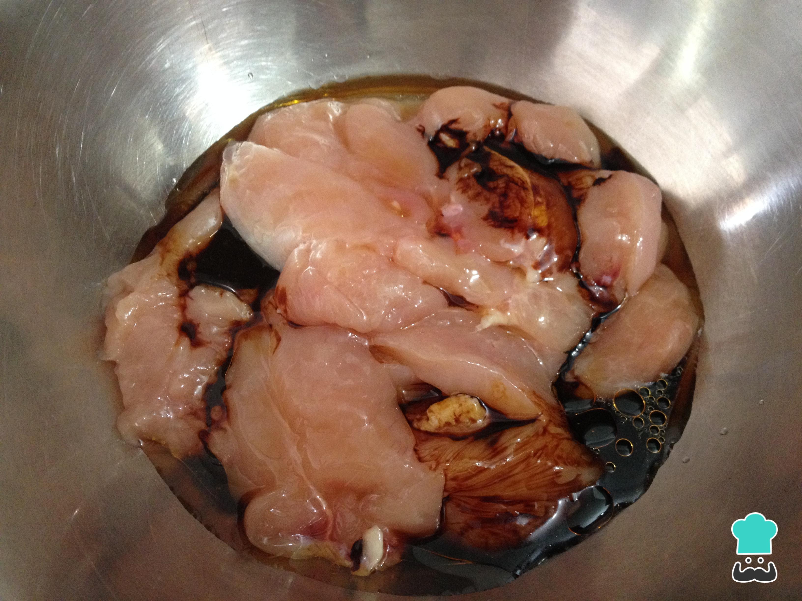 Em uma tigela coloque o frango cortado em pedaços, 2/3 do óleo de gergelim, 2/3 do molho de soja e o arroz de vinagre. Misture e reserve no frigorífico durante 30 minutos.