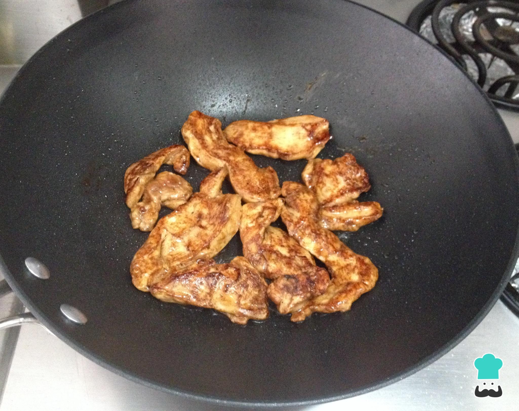 Em uma frigideira (de preferência wok) com um pouco de óleo vegetal, adicione o frango temperado e salteie até ficar cozinhado e dourado.