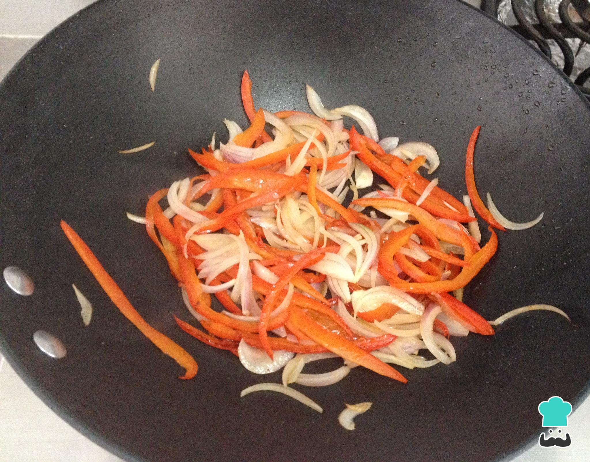Retire o frango e na mesma wok adicione um pouco do restante óleo de gergelim, a cebola e o pimentão cortados em tiras finas. Tempere com sal e pimenta e salteie até dourar. Adicione o alho finamente picado e cozinhe por mais 1 minuto.