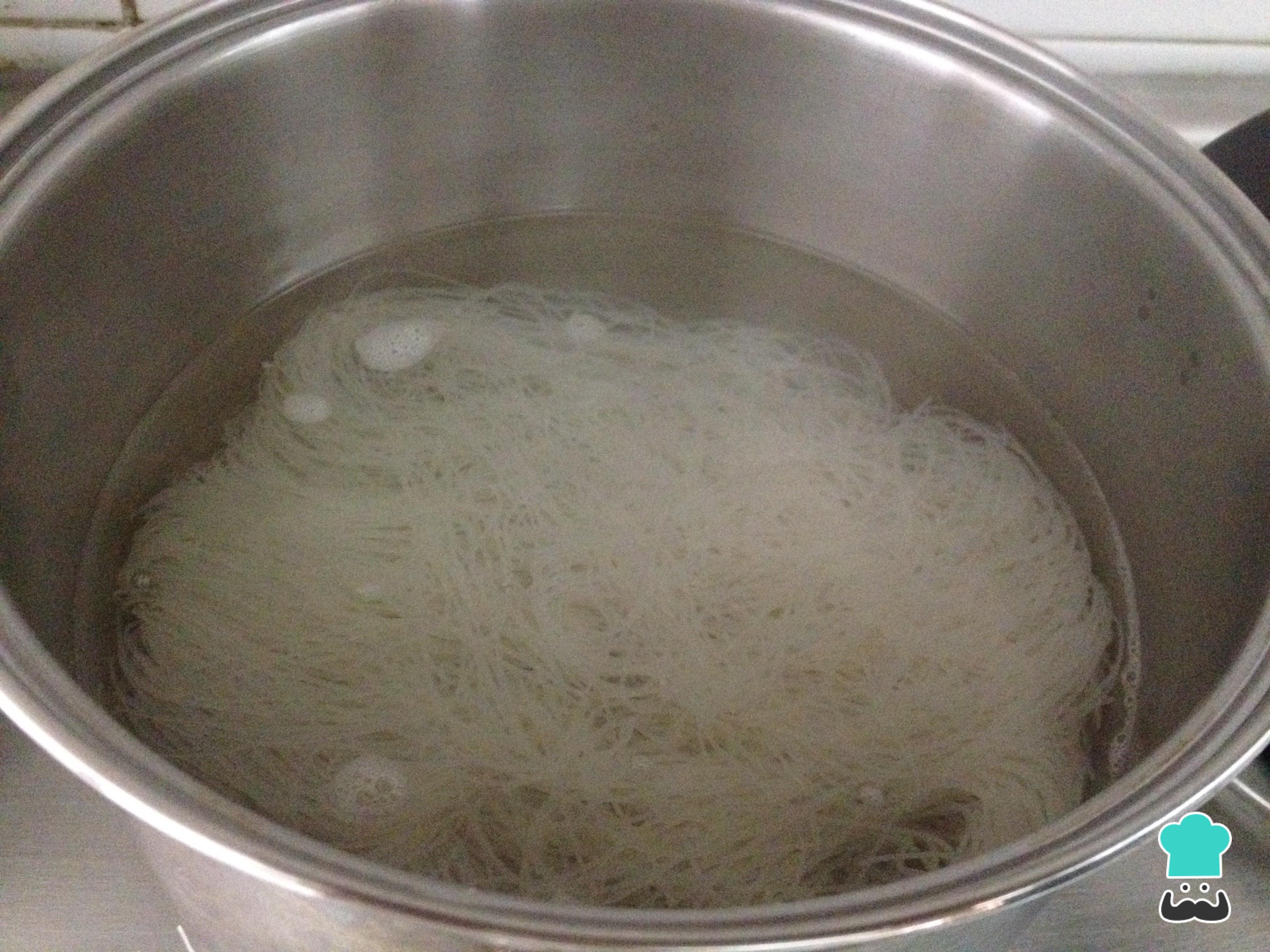 Enquanto isso leve ao fogo médio uma panela com água e sal e, quando estiver fervendo, desligue. Adicione o macarrão de arroz, deixe amolecer por cerca de 3 minutos e escorra.