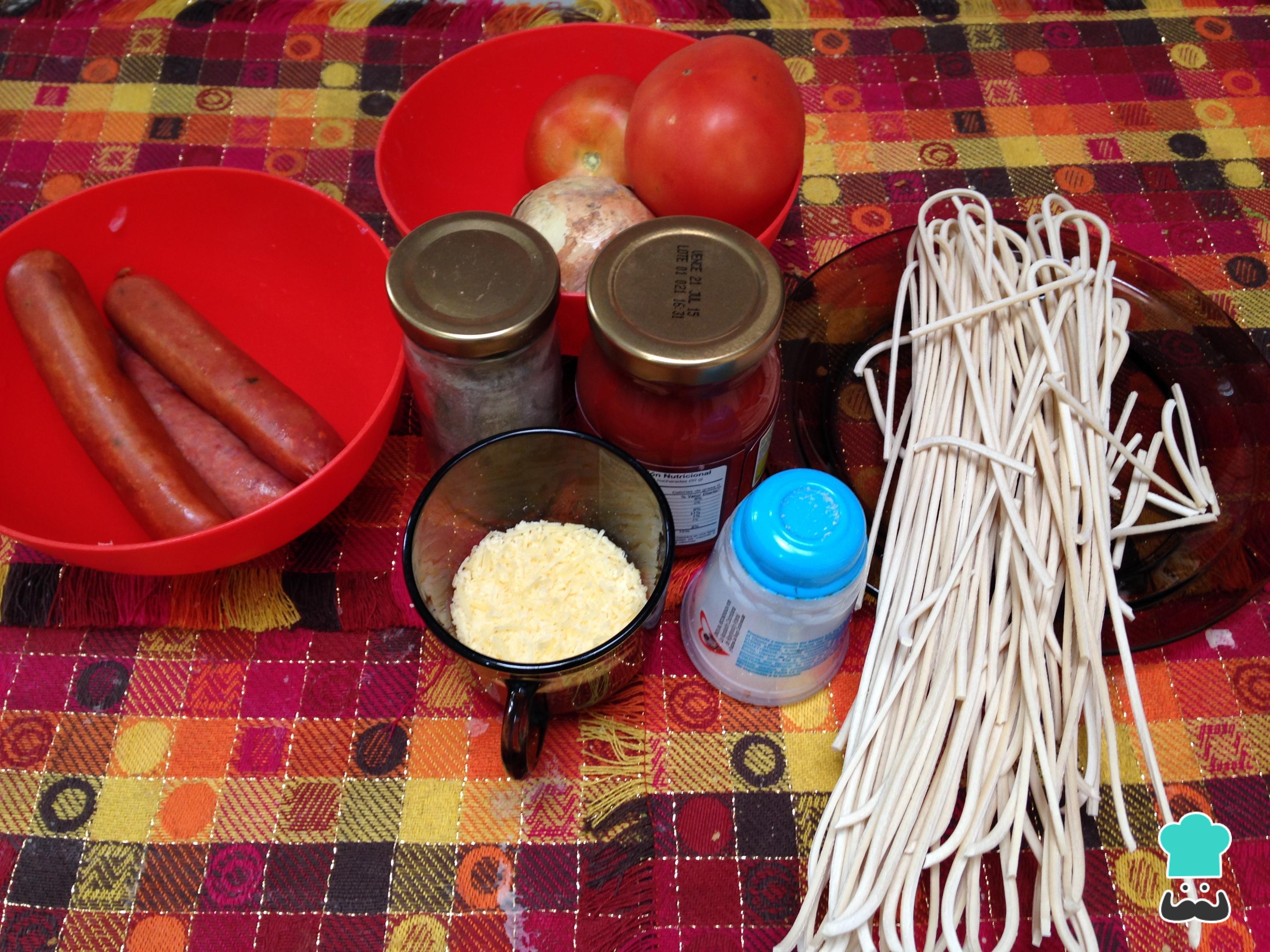 Para estes esparguete com linguiça você deve organizar todos os ingredientes primeiro. Estes ingredientes servem para 3 porções médias.