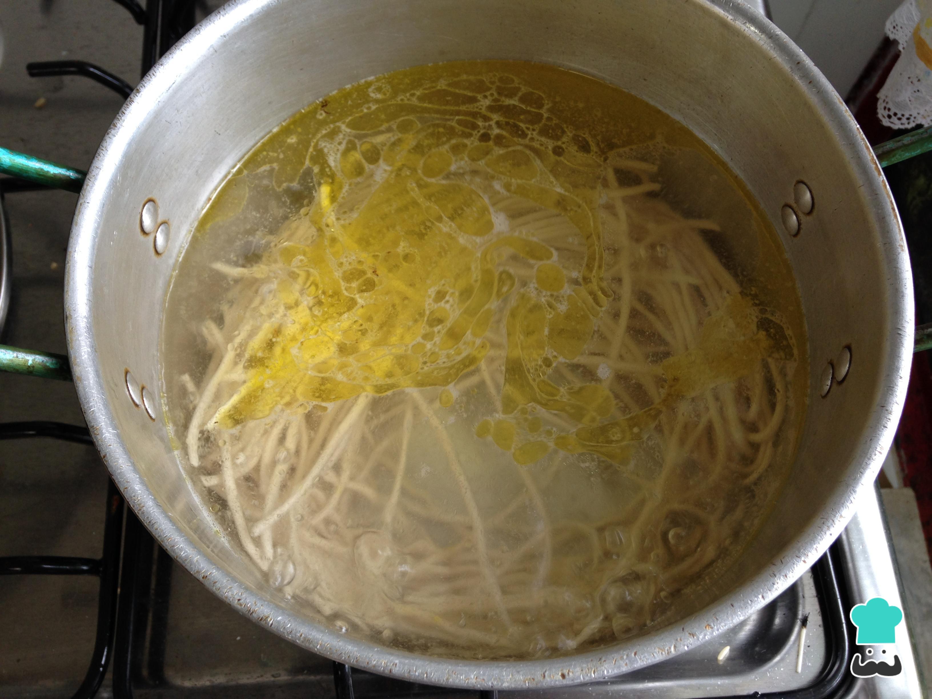 Em uma panela com bastante água fervente e um pouco de azeite, cozinhe o espaguete por 12 minutos.