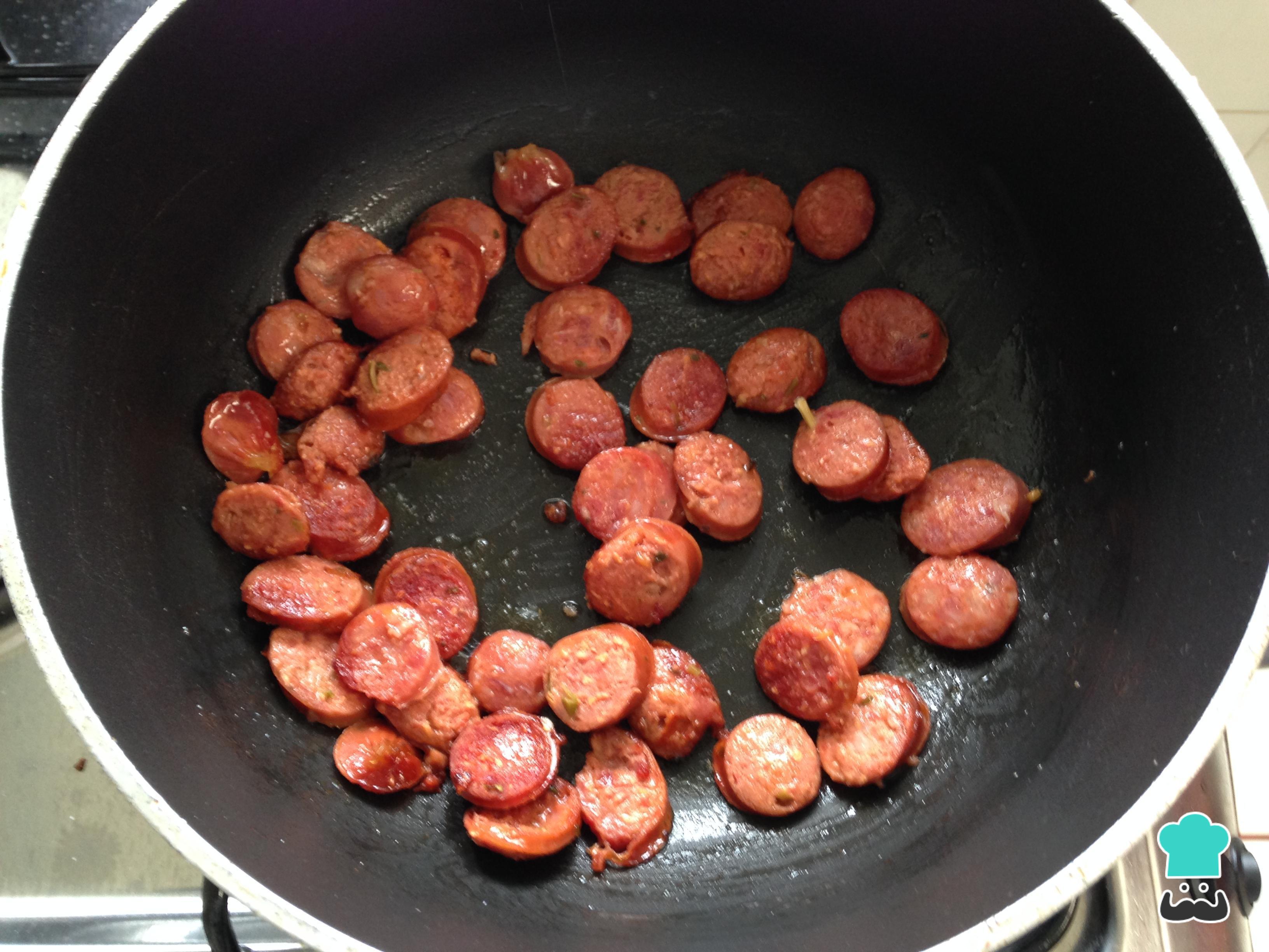 Corte a linguiça em fatias e doure em uma panela com um pouco de azeite. Quando dourar retire e reserve.