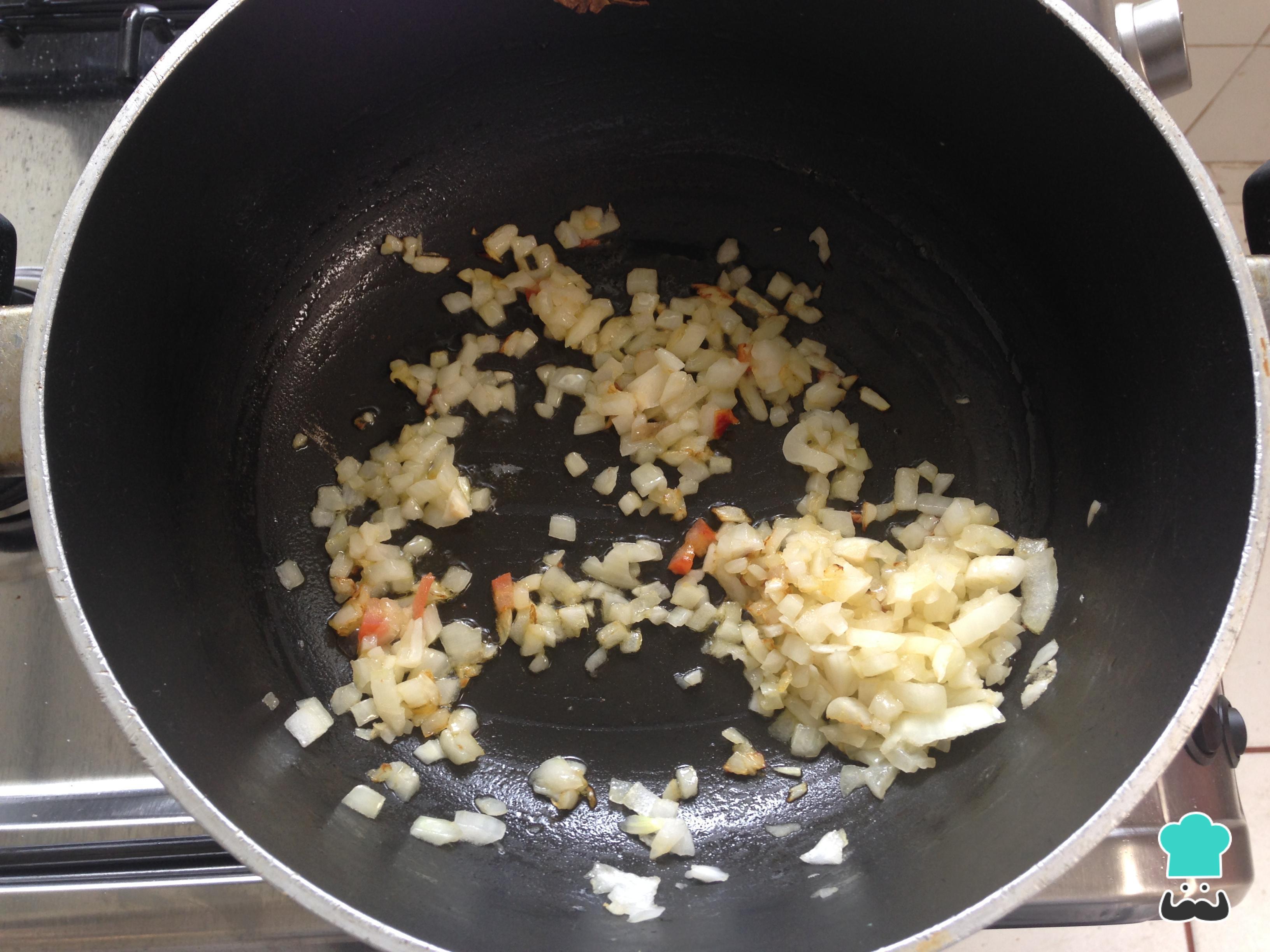 Pique a cebola em cubinhos pequenos e doure em uma frigideira por 3 minutos.