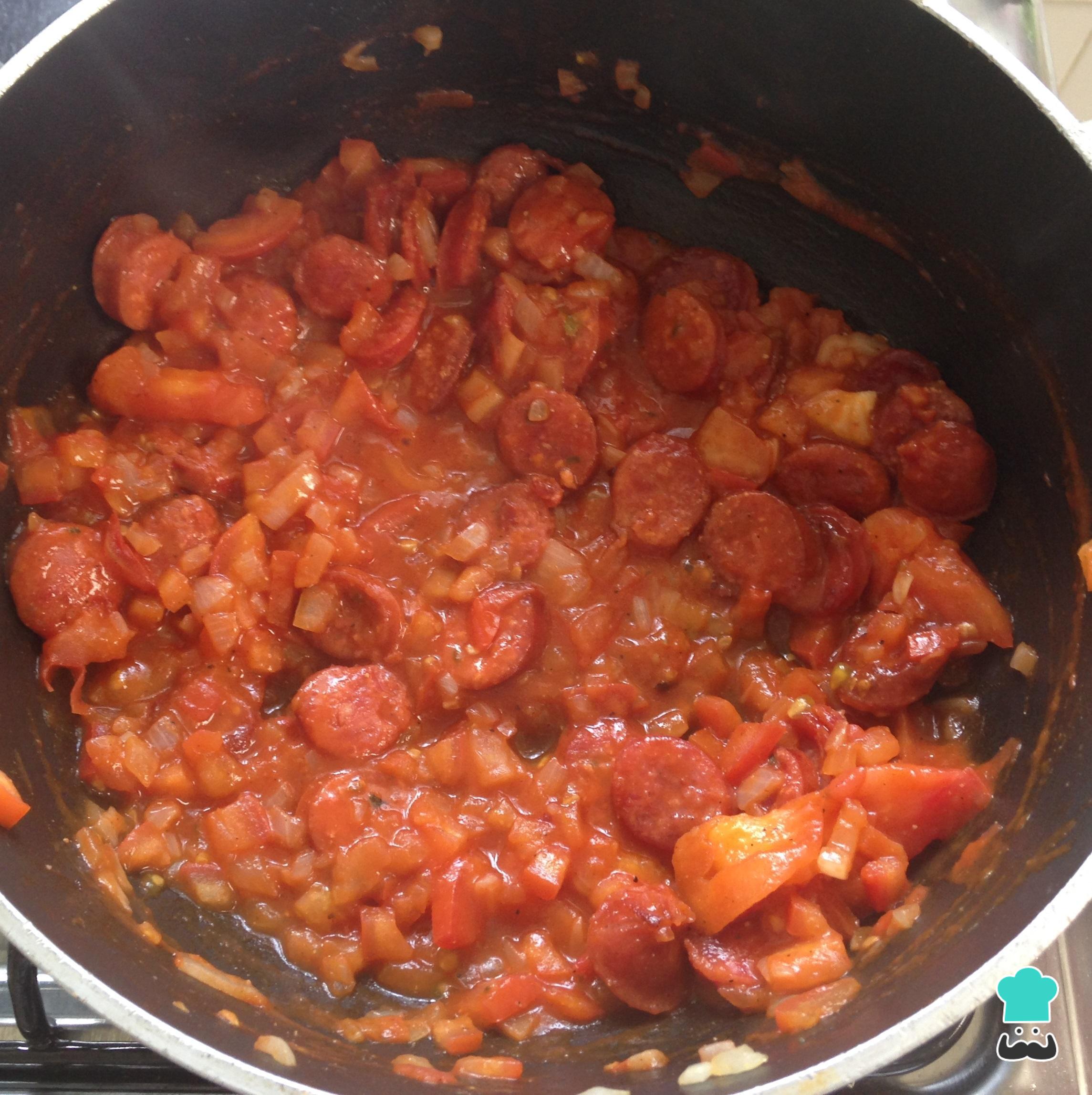 Adicione o tomate picado em cubos e 3 colheres de sopa de pasta de tomate. Cozinhe por 5 minutos mais e adicione a linguiça