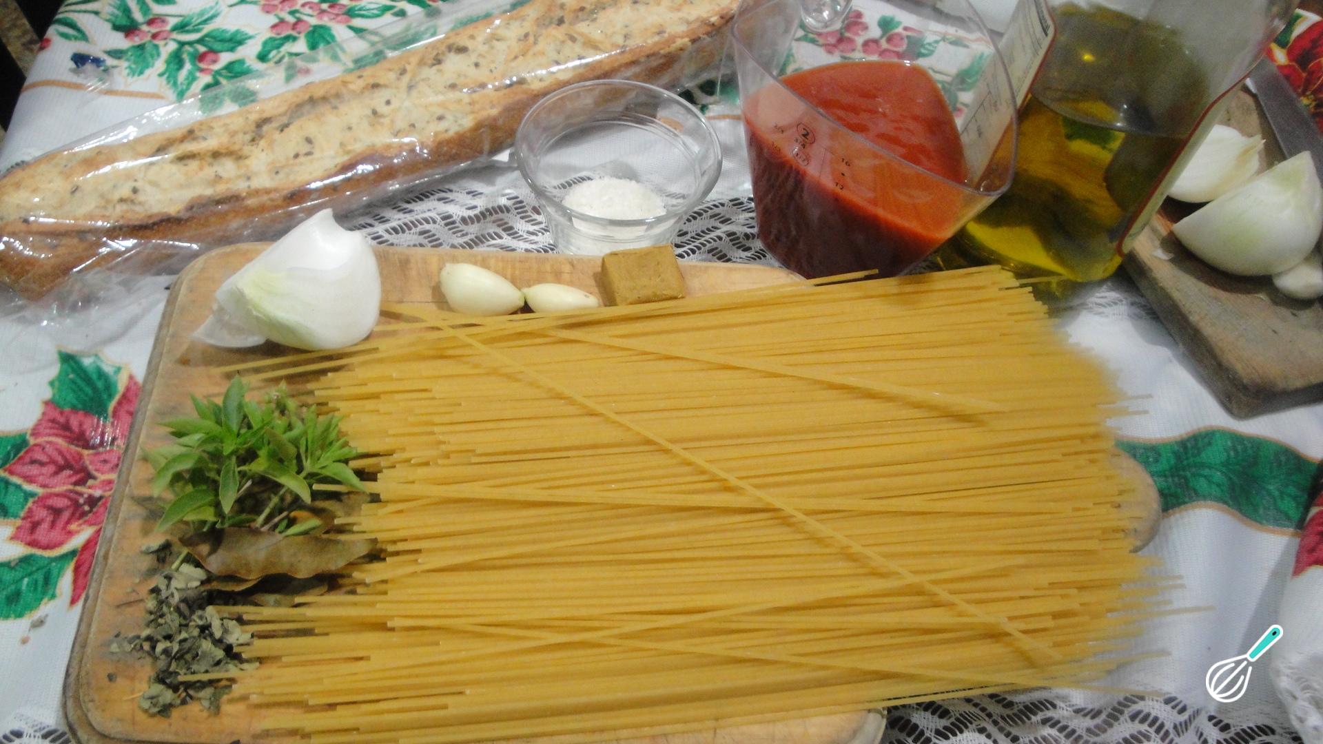 Como um primeiro passo, reúna todos os ingredientes necessários para fazer este prato de espaguete com molho vermelho.