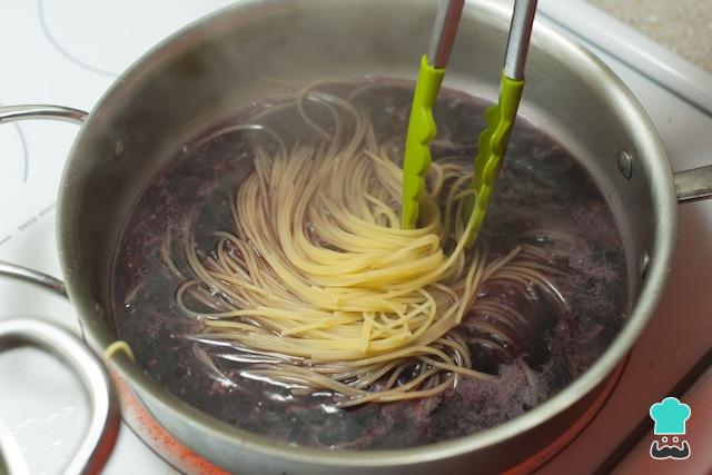 Para preparar o espaguete com vinho tinto fácil, cozinhar o espaguete em uma panela com água fervente e sal por metade do tempo indicado na embalagem.