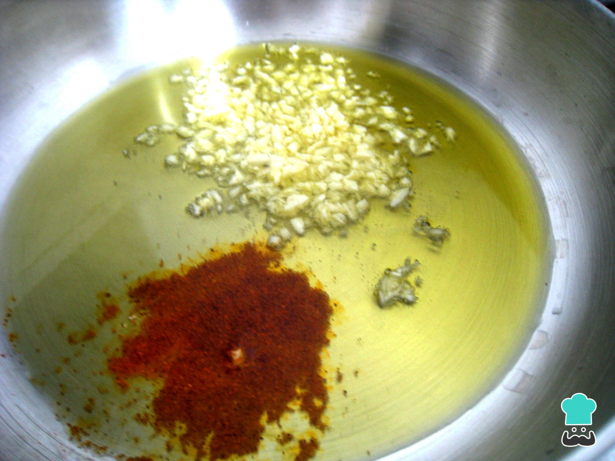 Em uma frigideira grande, aqueça o azeite em fogo médio e refogue o alho com a páprica até que incorporem o seu sabor.