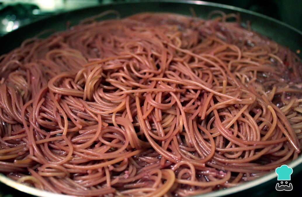 Em seguida, cozinhe o espaguete no litro de vinho tinto usando o resto do tempo, ou até que o macarrão fique al dente.
