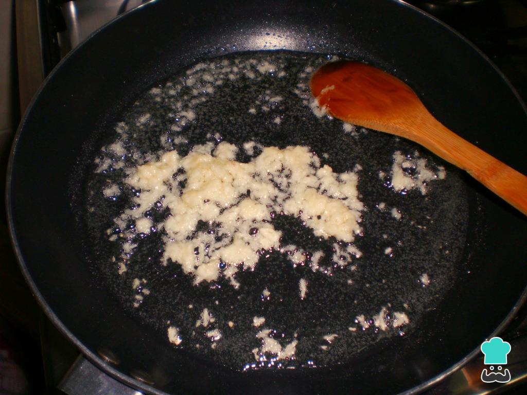 Coloque o alho picado numa frigideira com azeite e leve ao fogo até dourar. Junte a cenoura espiralada, tempere com sal e pimenta e junte os tomates cortados ao meio. Deixe refogar até ficar macia.