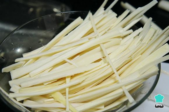 Dica: Atualmente é fácil você encontrar à venda pupunha pronto, já cortado em tirinhas como espaguete.