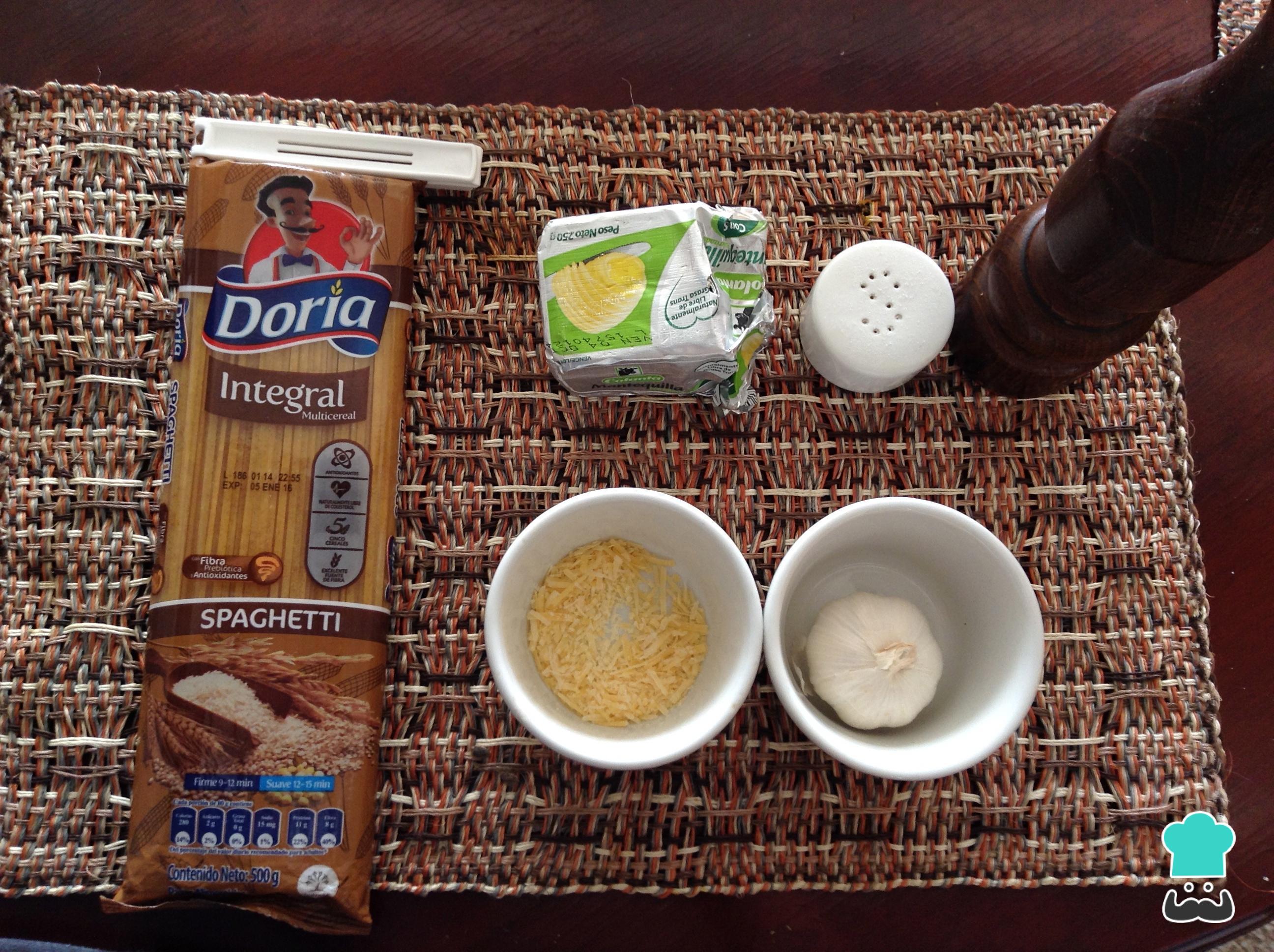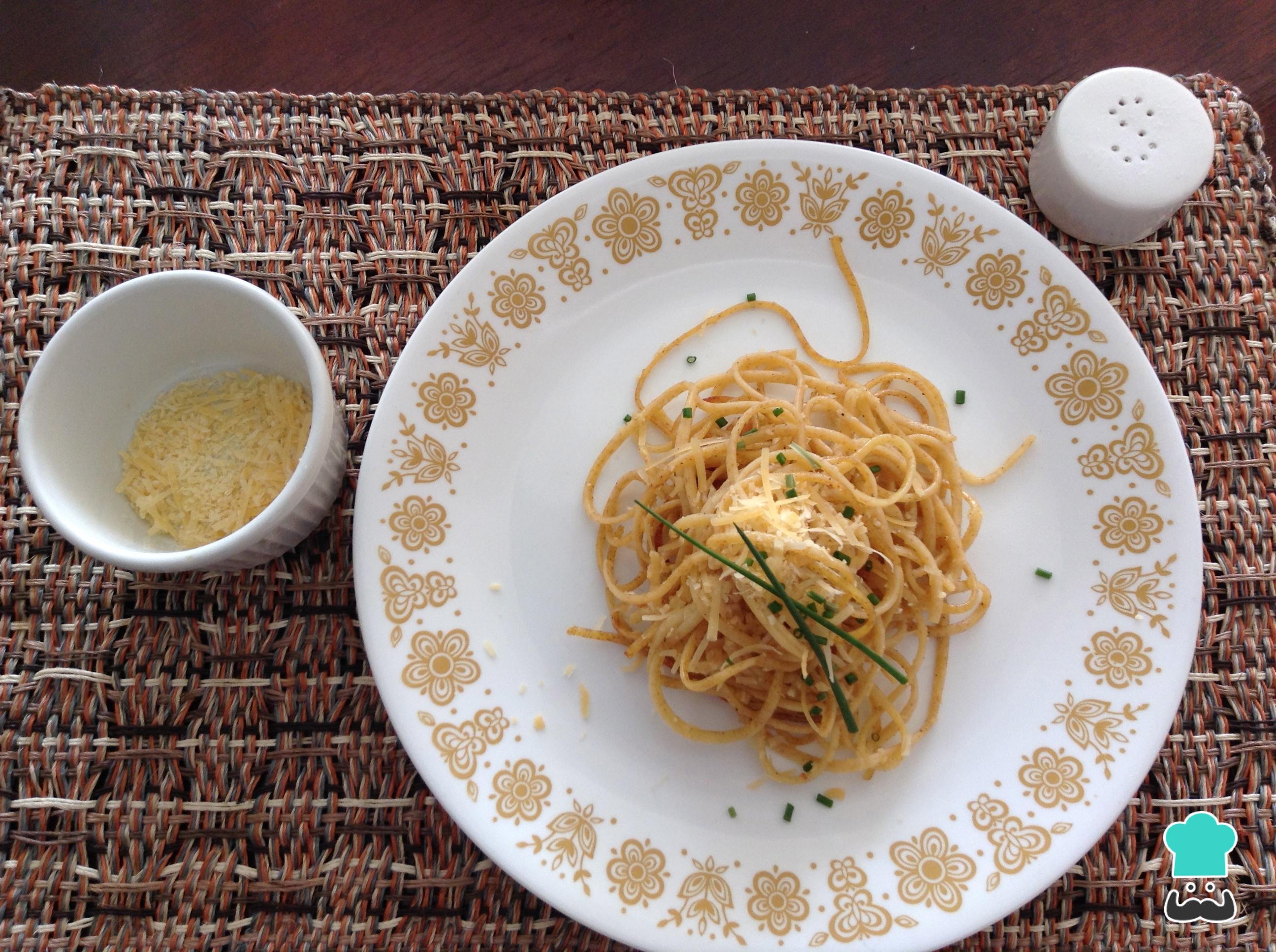 Para preparar esta receita de espaguete com queijo parmesão, o primeiro passo é reunir todos os ingredientes.