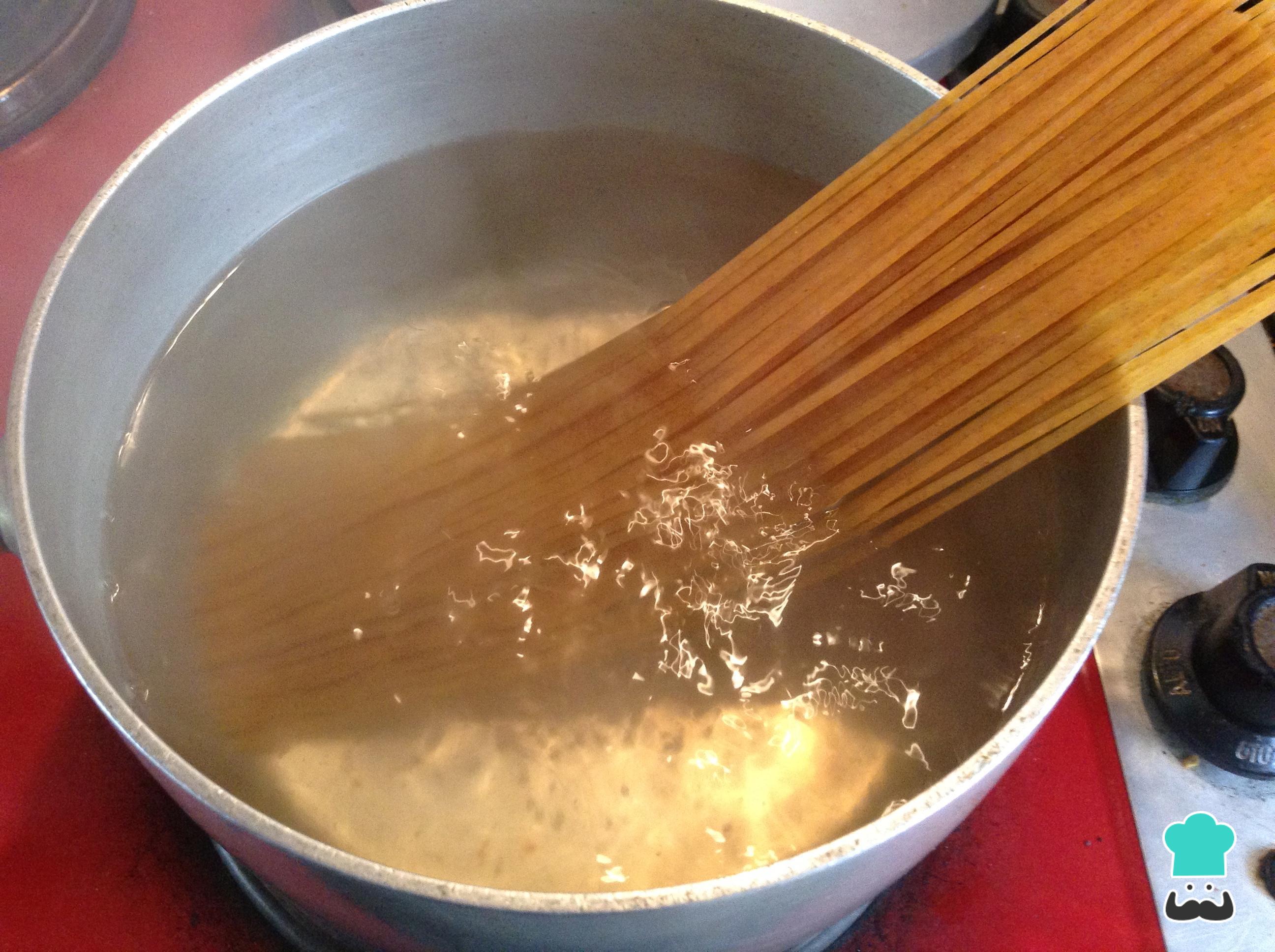 Leve ao fogo médio uma panela funda com água. Assim que estiver fervendo, acrescente o espaguete e cozinhe até que fique ao seu gosto.