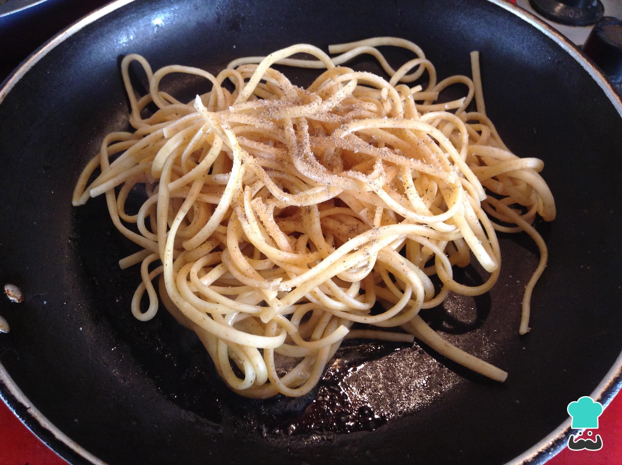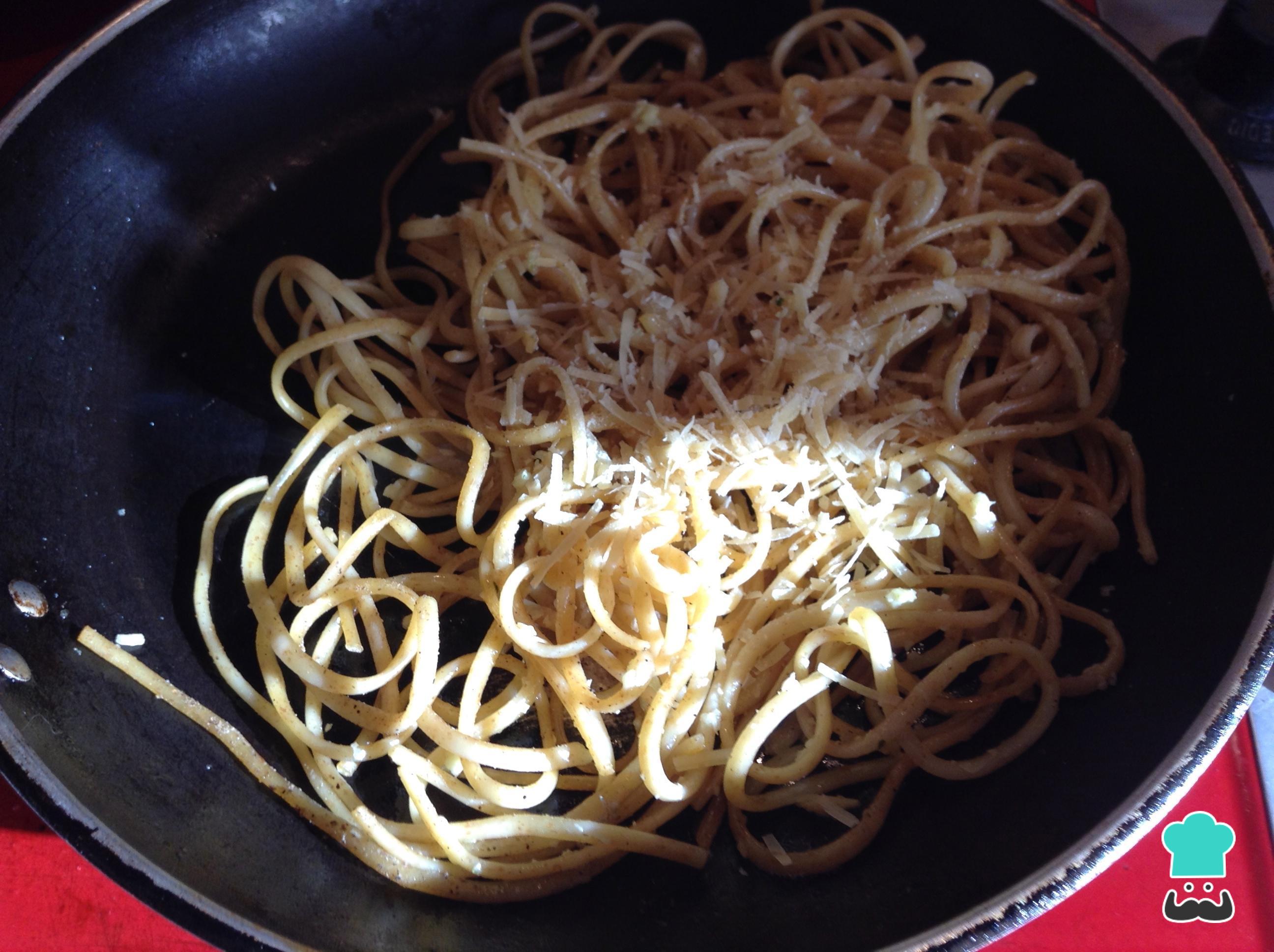 Após o passo anterior, acrescente o queijo parmesão e misture bem com o espaguete.